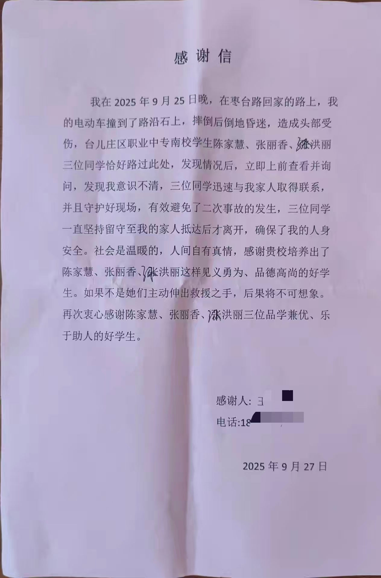 感谢信源自9月25日晚上的一场意外。市民王先生(化名)在枣台路骑电动车回家时,不慎撞上路沿石,重重摔倒后头部受伤昏迷。危急时刻,枣庄交通旅游学校南校的陈家慧、张丽香、洪丽(感谢信中提及,经核实应为孙洪丽)三位同学恰好路过。