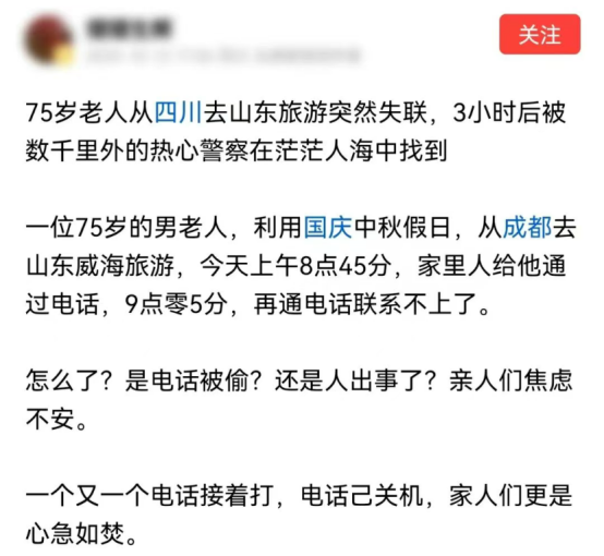 原来,老人在景区游玩时因误触,不小心将手机关机,直到发现后开机,才知道亲人们急坏了。