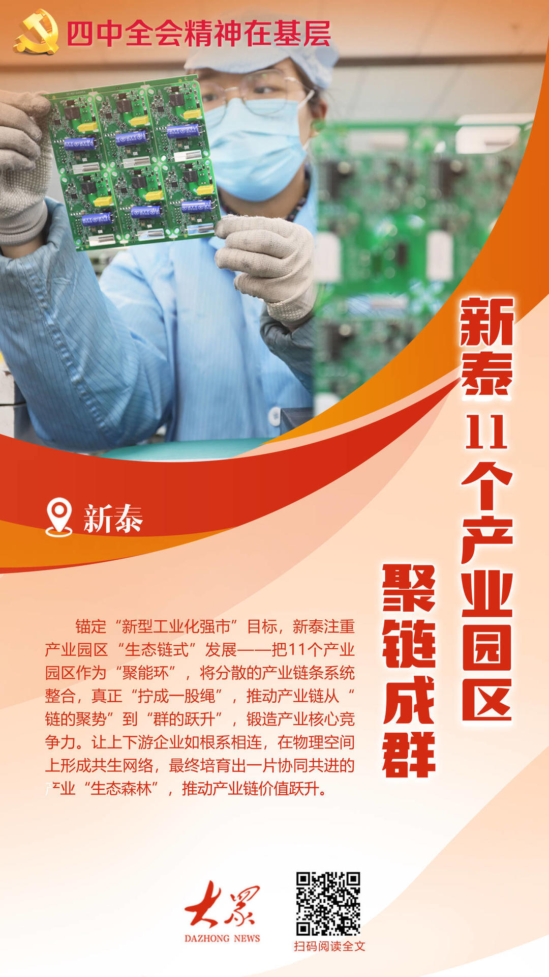 党的二十届四中全会提出,“建设现代化产业体系,巩固壮大实体经济根基”“构建以先进制造业为骨干的现代化产业体系”“优化提升传统产业,培育壮大新兴产业和未来产业”。“我们将深入学习贯彻全会精神,坚定不移把新型工业化作为高质量发展的总抓手,以智能化、绿色化、融合化为方向,加速沿链聚合、聚链成群,着力培育新质生产力,蹚出一条县域工业经济转型新路径。”新泰市委书记赵永斌表示。(记者 王洪涛 刘涛 通讯员 赵洁 卢建智)
