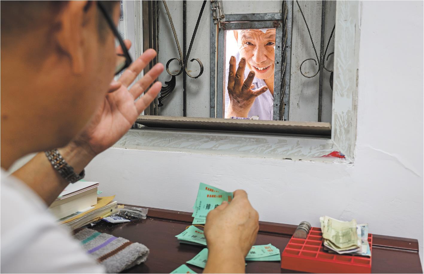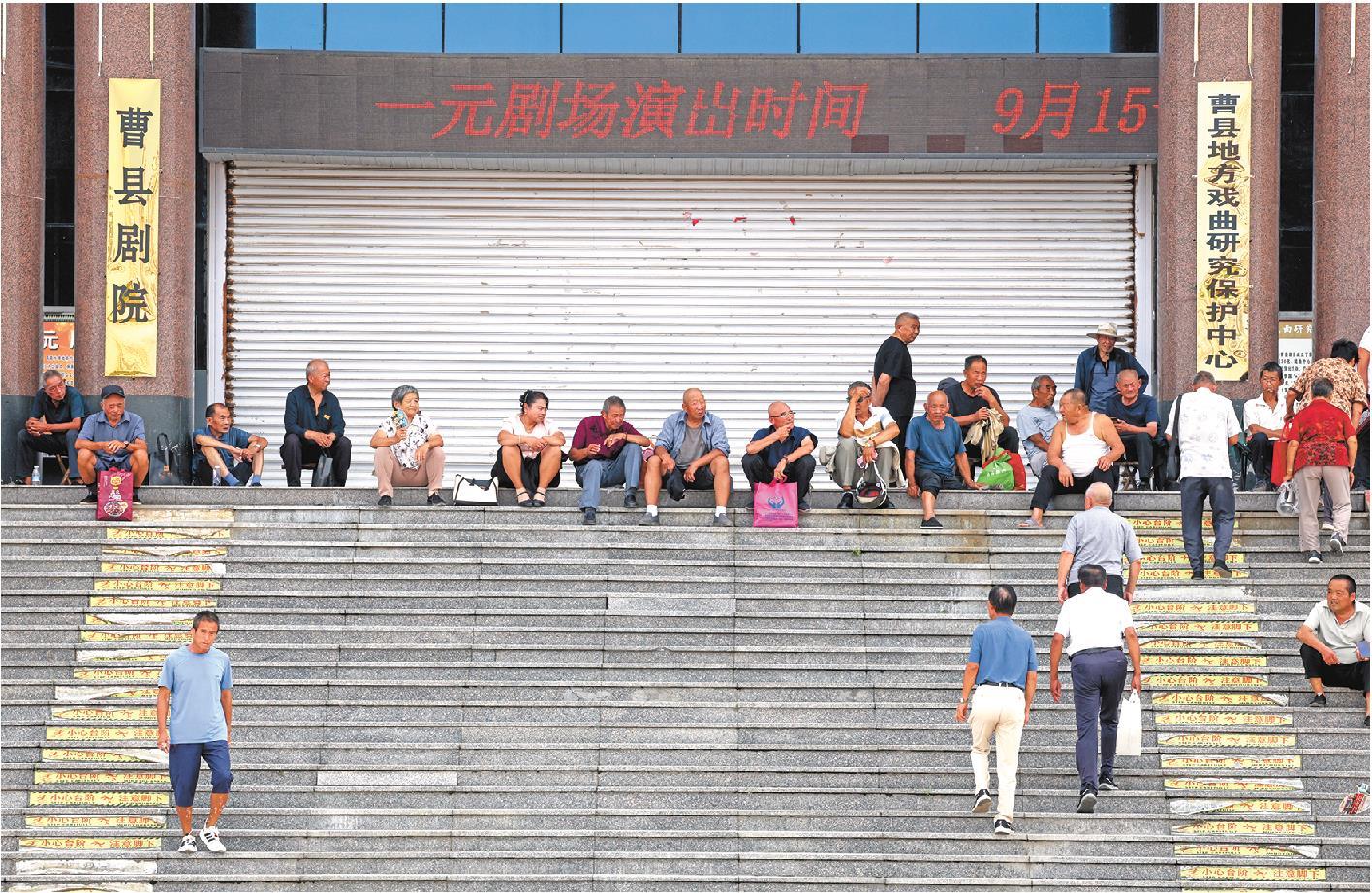 9月15日,在曹县剧院售票口,一位老人一下买了四张票,请老友们看戏。
