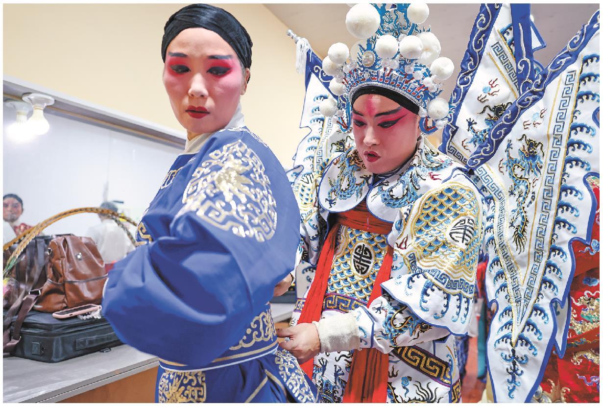 9月15日演出前,演员张磊为妻子郑姣萍整理着装,准备上场。