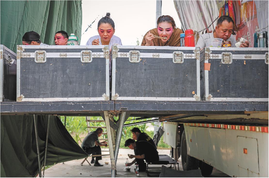 9月17日,在曹县郭楼村,上午两个小时的演出结束后,大家在舞台车上车下各自进餐。