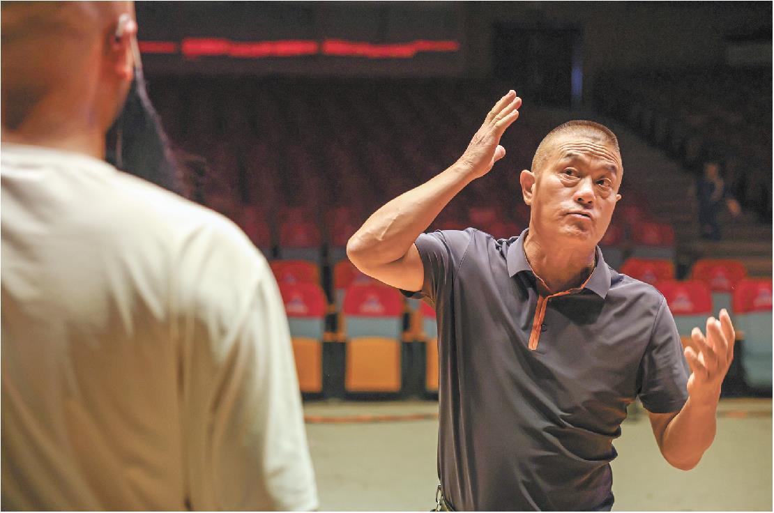 9月14日,曹县剧团排练中,团长伊平君指导实习演员胡家兴时表情投入。