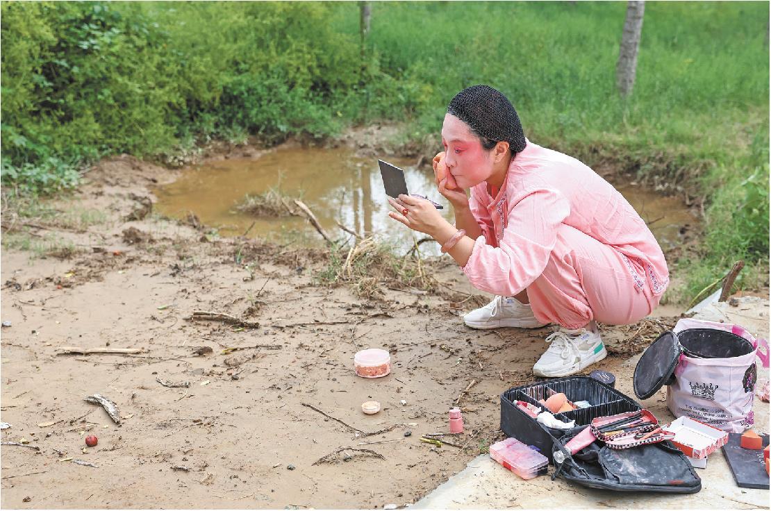 9月17日,一轮降雨刚结束,演员们在郭楼村玉米地边的水洼旁化妆。