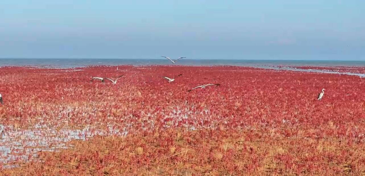 秋至山东,湿地宛如被打翻的调色盘。芦花飞雪,万鸟翔集,秋水共长天一色。金色黄河与蓝色渤海碰撞,如巨龙入海般形成“黄蓝交汇”奇观。