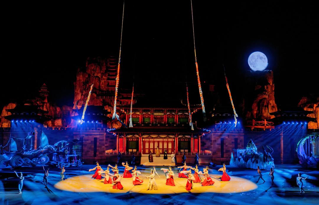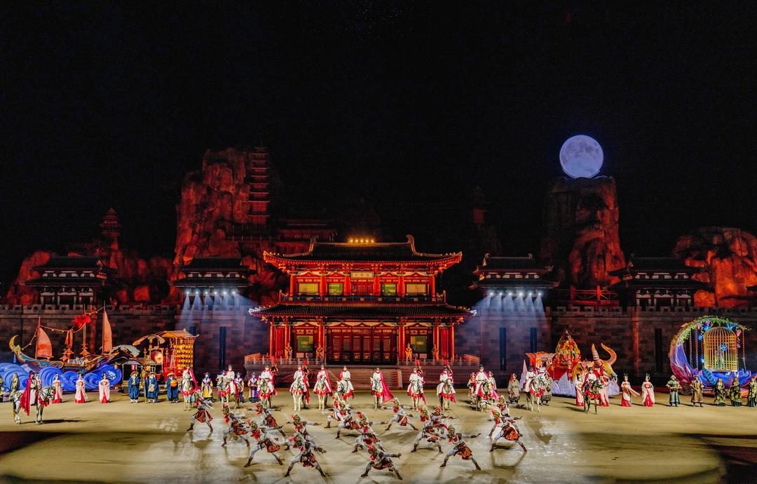 提升审美价值,用视听矩阵陈列出一场宏大的美学盛宴。据景区相关负责人剧透,该剧目以大唐中后期历史事件为故事主线,讲述琅琊颜氏家族在乱世中的坚守与牺牲,生动诠释中华民族公忠爱国、自强不息的人文品格。演出阵容堪称豪华,由150余名专业演员倾力演绎,同步融入上百匹马、骆驼、渡鸦及捷克狼犬等动物,搭配千余台灯光与舞美道具,构建出多维立体的视听矩阵。值得一提的是,剧场内特设全国首创环场跑马赛道,融合马道、水中、山体、环城四大特色跑法,巍峨城墙与两侧箭楼构就完整环形跑道,山体外侧特设升降 LED 屏,火山喷发、流水奔涌、烟火璀璨等特效轮番上演,为观众带来强烈感官冲击。其专属秀场可容纳约4200名观众同时观演,多项创意设计创下全国行业先例。