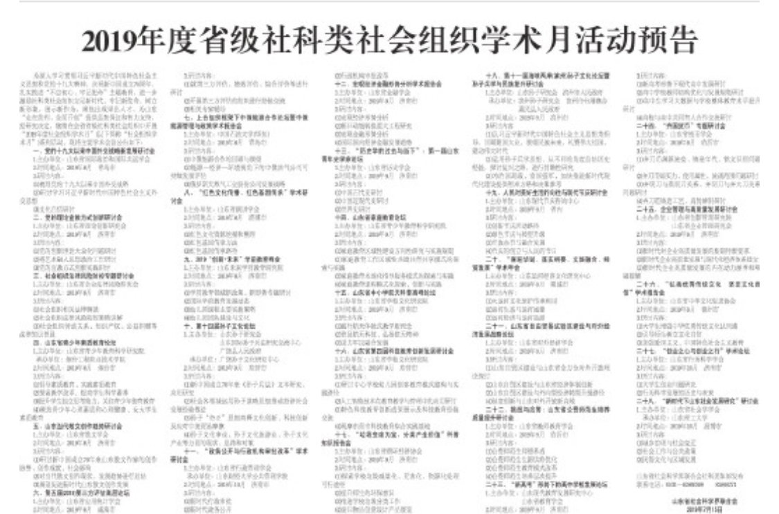 为深入学习贯彻习近平新时代中国特色社会主义思想和党的十九大精神,庆祝新中国成立70周年,扎实推进“不忘初心、牢记使命”主题教育,进一步激励社科类社会组织立足新时代,牢记新使命,树立新形象,展示新作为,聚焦出成果出人才,为山东“走在前列、全面开创”提供思想保证和智力支持,经研究决定,继续在全省省级社科类社会组织中开展“2019年度社会组织学术月”(以下简称“社会组织学术月”)系列活动。现将主要学术会议公告如下: