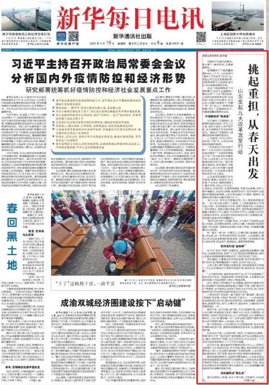 3月19日,新华每日电讯头版刊发《挑起重担,从春天出发 山东发起九大改革攻坚行动》,聚焦山东改革攻坚行动。全文如下: