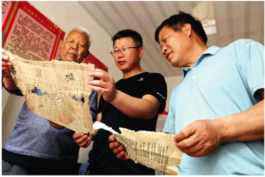 受父亲影响,自主创业的儿子范华建(中)也爱上了村里的文化,不管到哪儿,只要看到与孟姜女有关的器物、资料,他都拿回来交给父亲范玉祥(右),爷俩就和村里的老人一起研究。