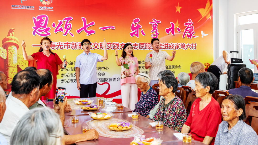 曾经盐碱地茫茫、衣食难温饱的寇家坞六村,如今不但在乡村振兴的康庄大道上阔步向前,更是把老年人集中供养当作民生大事来办,投资200余万元建成颐馨苑康养中心,实现了村里75岁以上老年人每天两餐集中供应,每人每天交1-4元钱,就可以吃上荤素搭配、营养可口的午餐、晚餐。这种集中供养模式正在双王城生态经济园区大力推广,这也是寿光市新农村小康生活的缩影。为了让实现“老有所养”的农村老年人,在精神生活方面更上层楼,真正实现“老有所乐”,寿光市文艺志愿者选择在党的生日这天,通过文艺志愿服务的形式,让寇家坞六村康养中心的老年朋友们真正感恩党、乐小康。