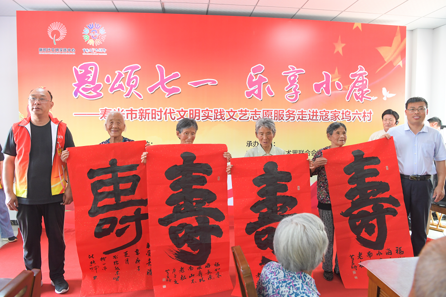 寿光书协、美协文艺志愿者现场挥毫泼墨,一幅幅翰墨飘香的“福”“寿”书法作品送到了每位老年朋友手中,志愿者们还向村里的5名老党员赠送了美术作品,祝福他们健康长寿。