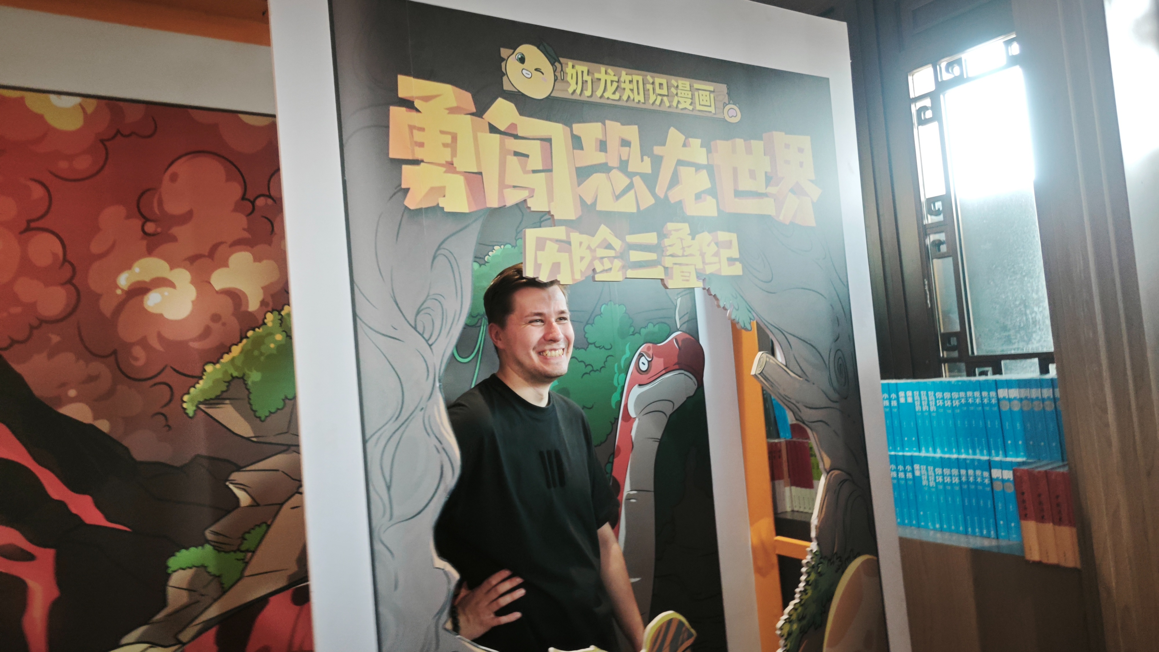 离开陶琉会后,这群外国网红来到了淄博的地标性建筑——海岱楼。这座集书店、咖啡馆、文创商店于一体的复合式文化空间,因其独特的建筑设计被誉为“中国最美书店”。步入建筑,挑高空间搭配错落书架,暖黄灯光透过玻璃穹顶洒下,营造出静谧又雅致的阅读氛围。大家时而驻足翻看中外书籍,时而在落地窗前眺望周边湖景,摄影师们则忙着用镜头捕捉书架与光影的和谐之美。