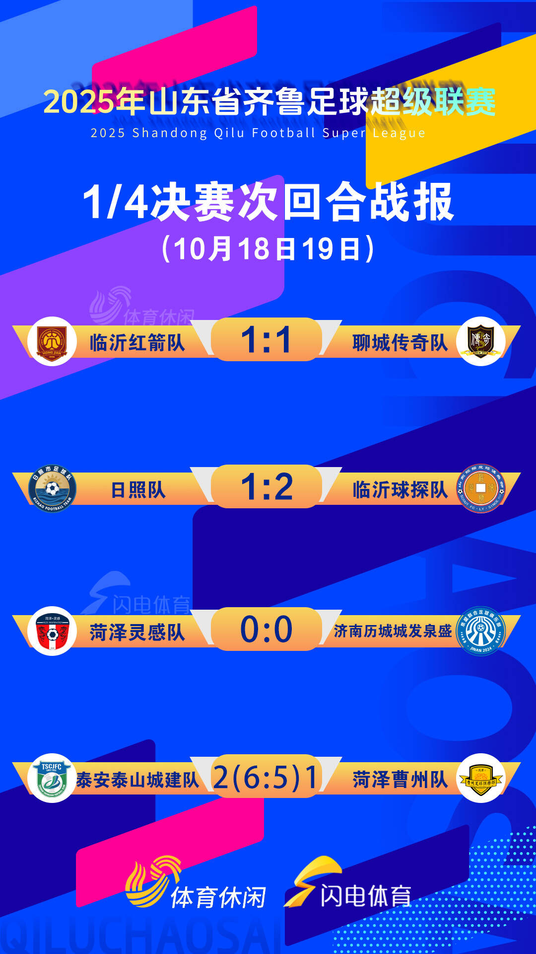 10月19日齐鲁超赛八强赛次回合结束争夺,泰安泰山城建队点球大战淘汰菏泽曹州队,锁定最后一个四强名额。稍早进行的一场比赛中,济南历城城发泉盛客场0-0战平菏泽灵感,两回合总比分4-1晋级。