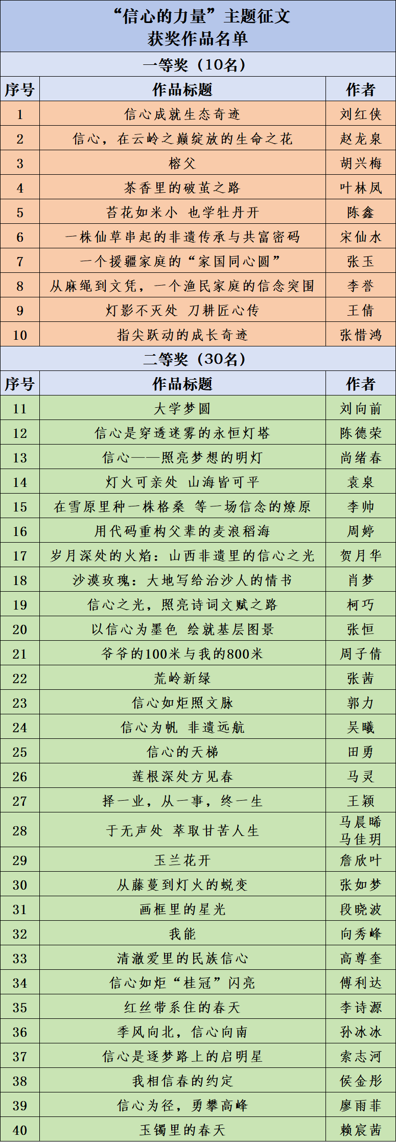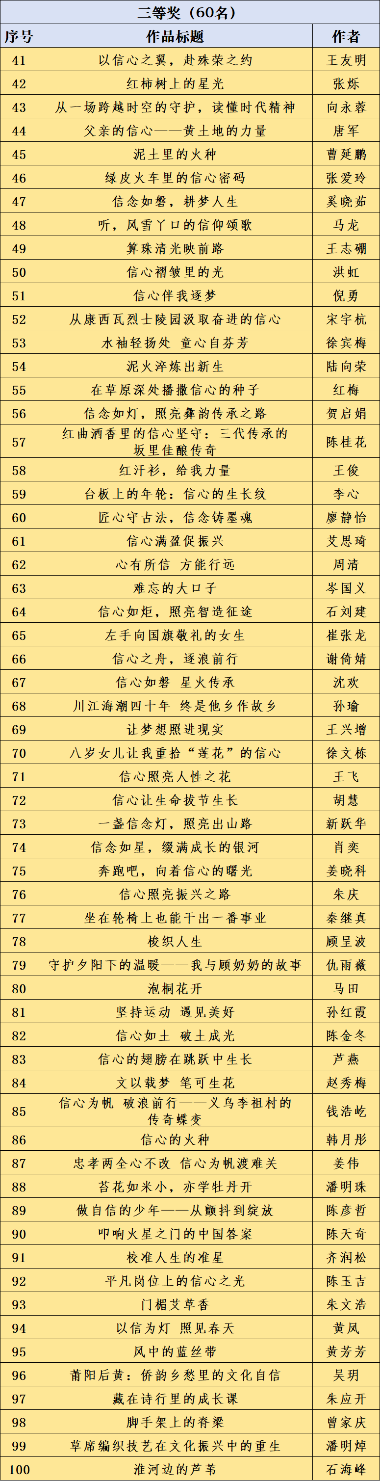 为回馈广大用户的积极参与,近期,“学习强国”学习平台邀请有关专家,本着公平、公正的原则,从总平台上线的800余篇作品中评选出优秀作品100篇,为作者颁发获奖证书。其中,山东12篇作品获奖,分别是济南《信心——照亮梦想的明灯》(作者:尚绪春)《绿皮火车里的信心密码》(作者:张爱玲)《校准人生的准星》(作者:齐润松 指导老师:张啸 刘洪光);青岛《川江海潮四十年 终是他乡作故乡》(作者:孙瑜)《信心照亮人性之花》(作者:王飞);淄博《泡桐花开》(作者:马田);东营《信心是逐梦路上的启明星》(作者:索志河);潍坊《红柿树上的星光》(作者:张烁 指导老师:于丽杰);泰安《算珠清光映前路》(作者:王志硼);临沂《我相信春的约定》(作者:侯金彤 指导老师:徐欣);菏泽《信心如炬照文脉》(作者:郭力)《让梦想照进现实》(作者:王兴增)。