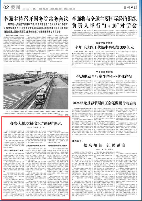 12月6日出版的《光明日报》在第2版,以《齐鲁大地吹拂文化“两创”新风》为题,聚焦山东深耕齐鲁人文沃土,持续推动中华优秀传统文化创造性转化、创新性发展,高质量推进文化强省建设。