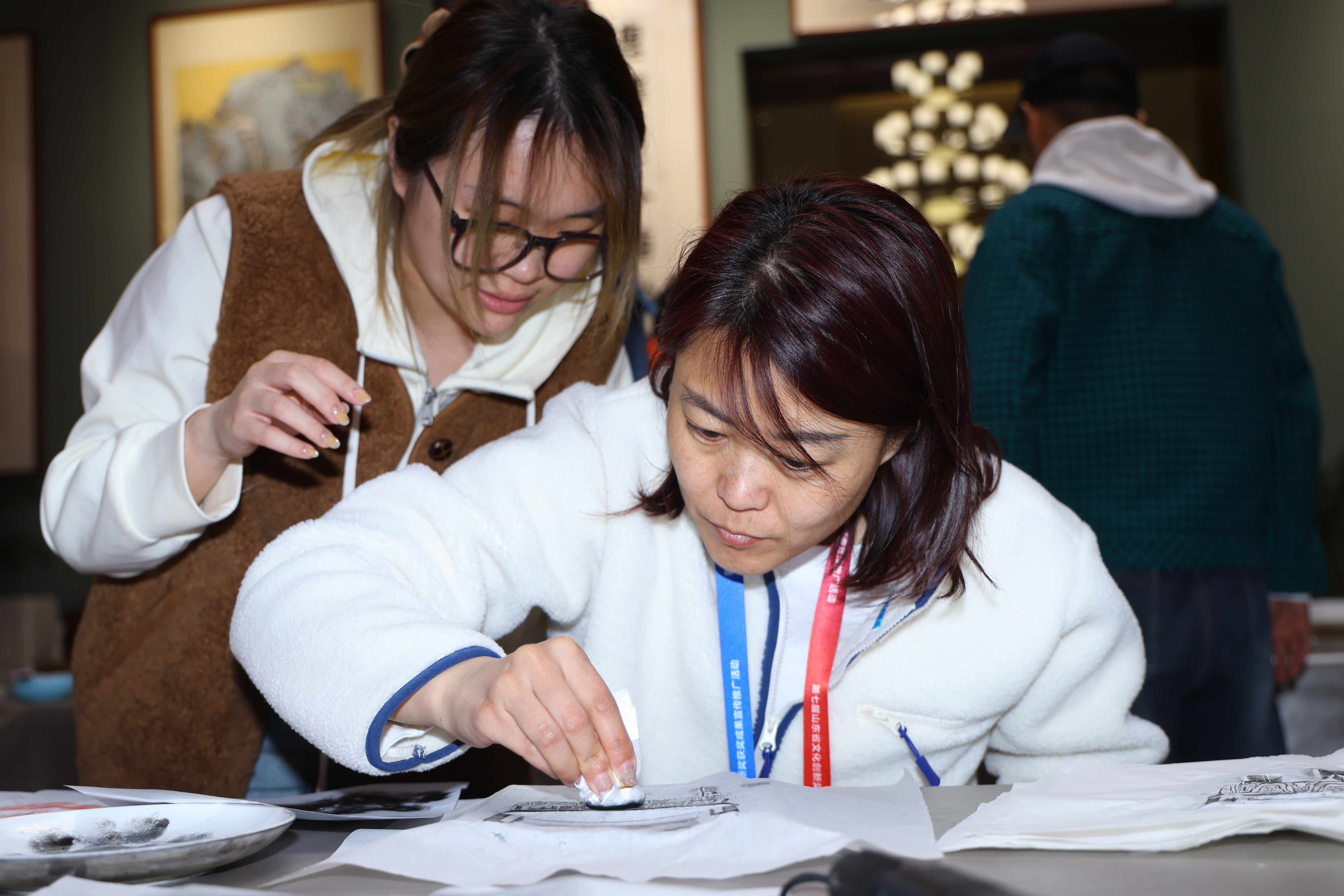 游客在体验拓印和潍坊风筝扎制(赵森 摄)