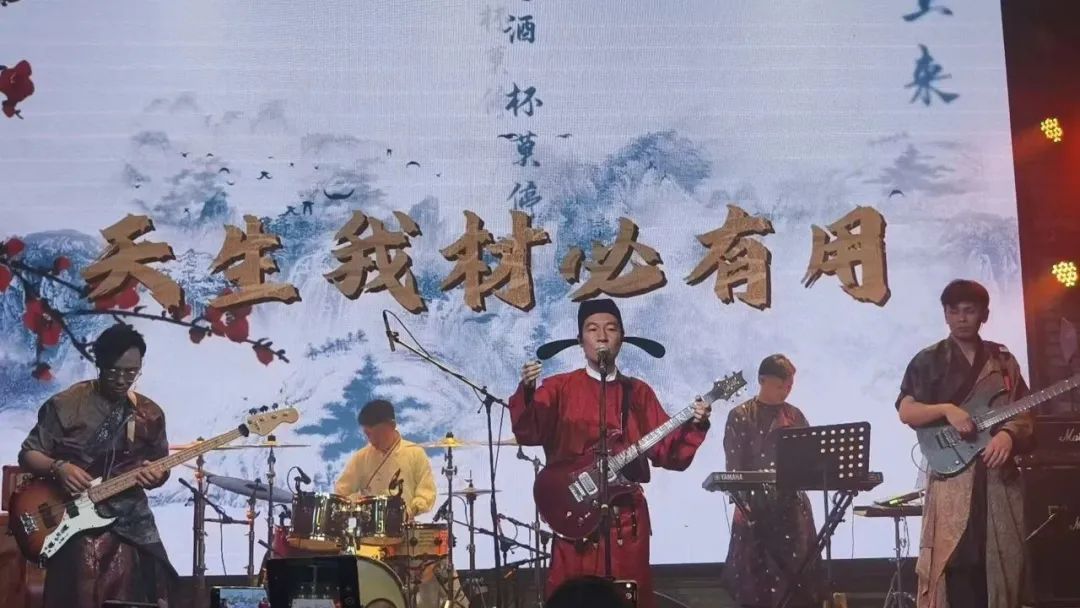 面向大众的流行音乐领域,这种融合创新也早已形成潮流。最早有《前门情思大碗茶》,后来是《新贵妃醉酒》,如今广州音乐人梁正的探索独树一帜——他以“粤语+摇滚”的形式,让古诗在Livehouse的律动中鲜活起来。粤语保留大量古音,九声六调的韵律与诗词平仄天然契合,其演绎的《将进酒·君不见》便是例证,“天生我材必有用,千金散尽还复来”的粤语吟唱,既还原了诗句的苍劲古韵,又借声调起伏放大了李白的豪迈气魄,发布之初便凭这份和谐感收获奇高播放量。