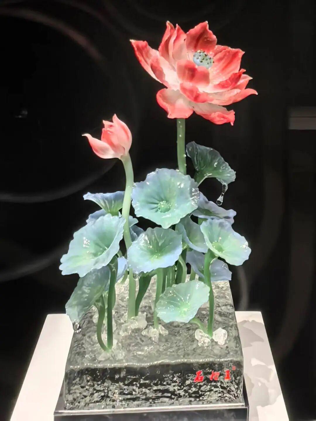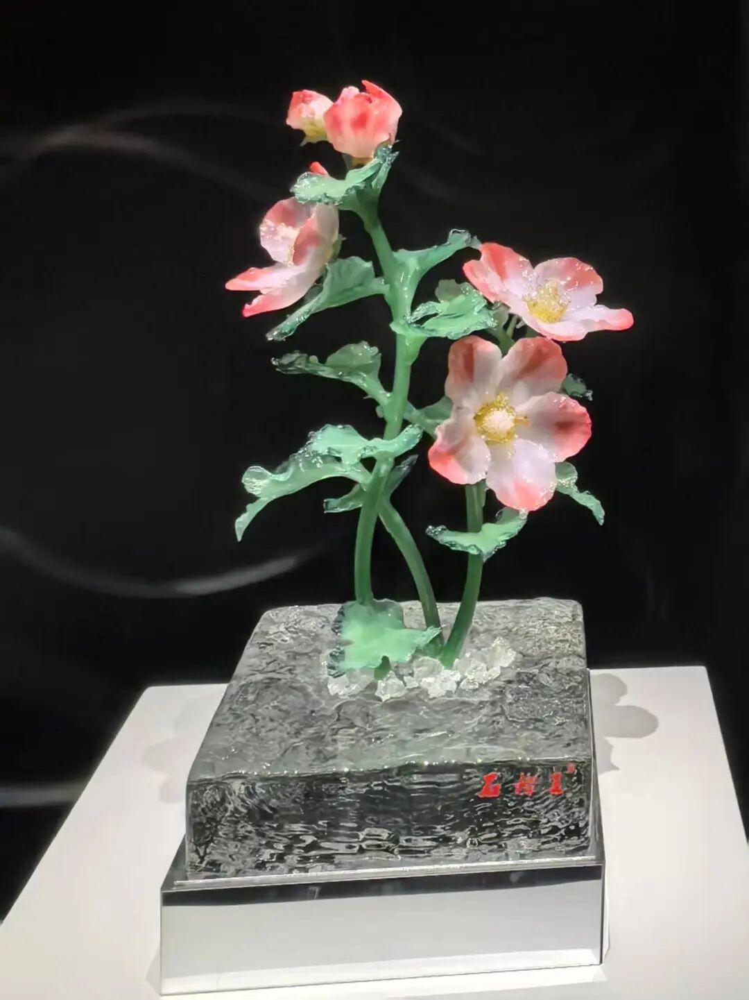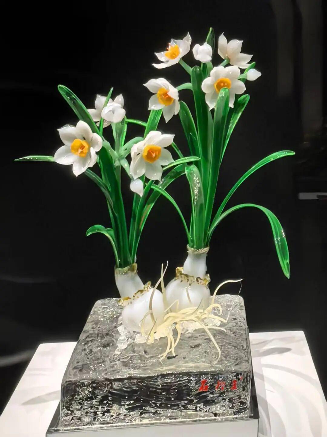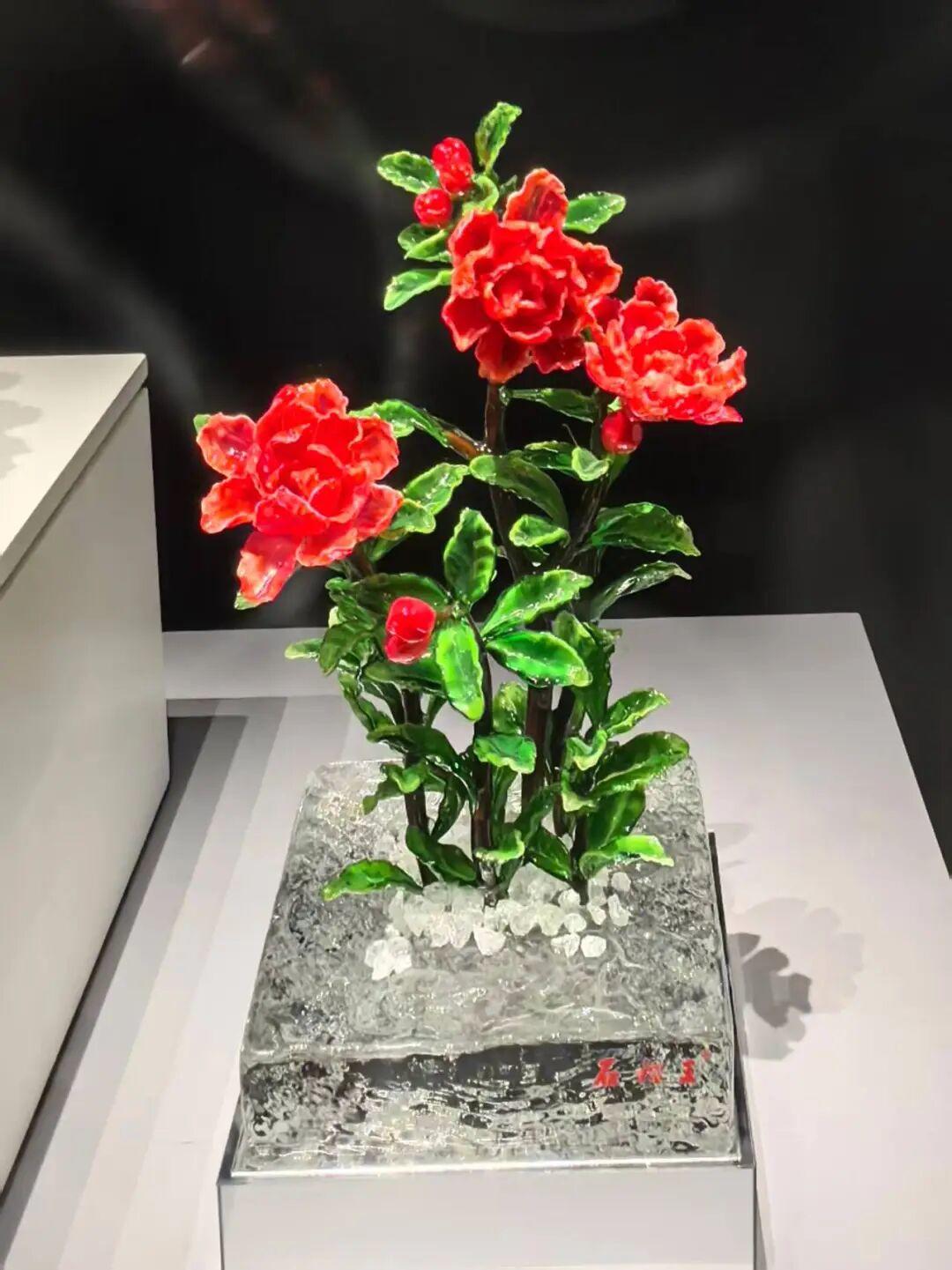 这组作品出自山东省工艺美术大师宋苗之手。在琉璃工匠们的眼中,琉璃成型后看似冰冷的材质,源自于“火中的雕塑艺术”。在千度高温的火焰下,琉璃料棒被精准掌控,拉丝、点缀、塑形,每一个呼吸的间隙都考验着力道与温度的博弈。正月梅花的凌寒、六月荷花的清雅、腊月水仙的灵动,皆在方寸之间被真实还原。