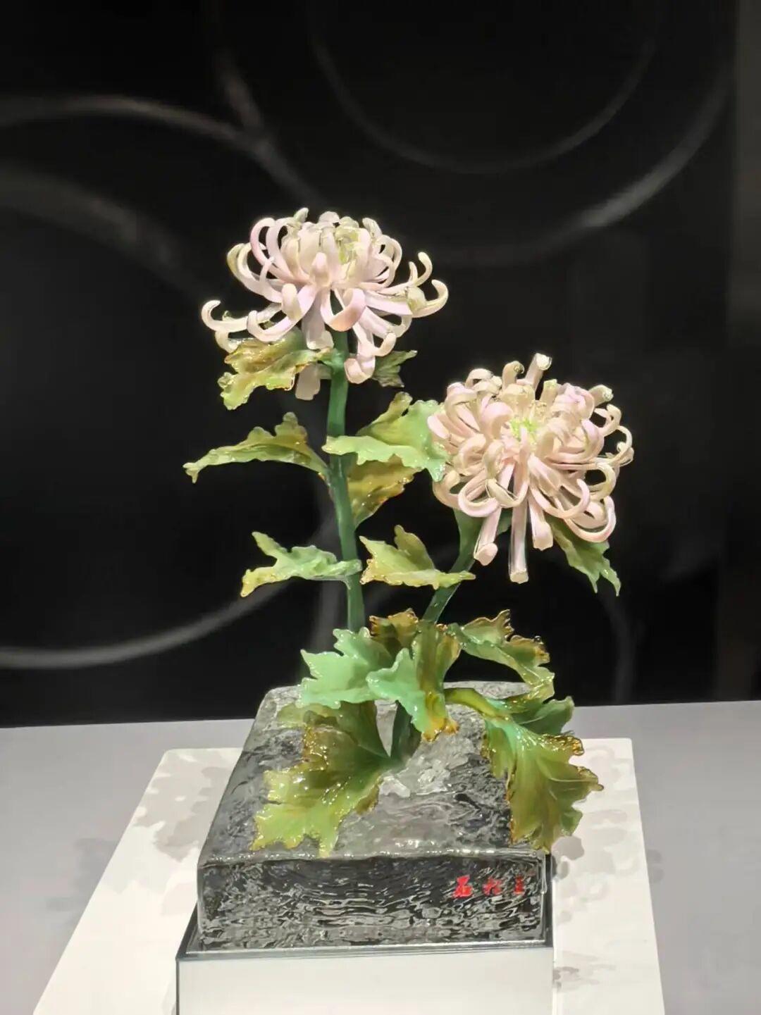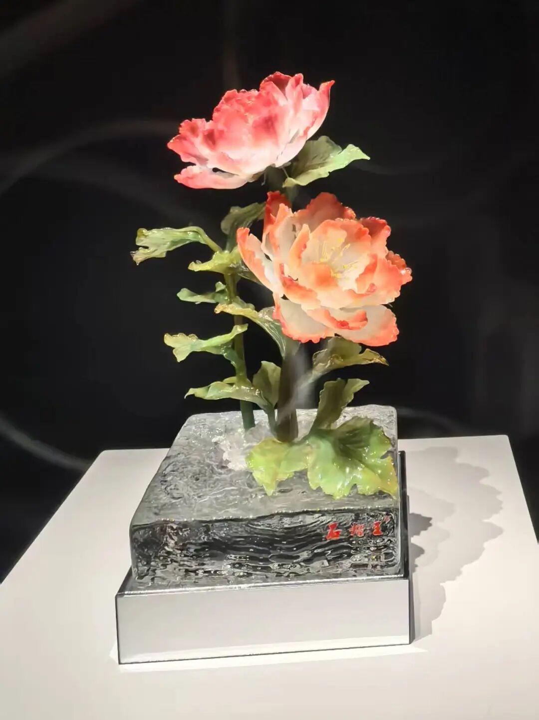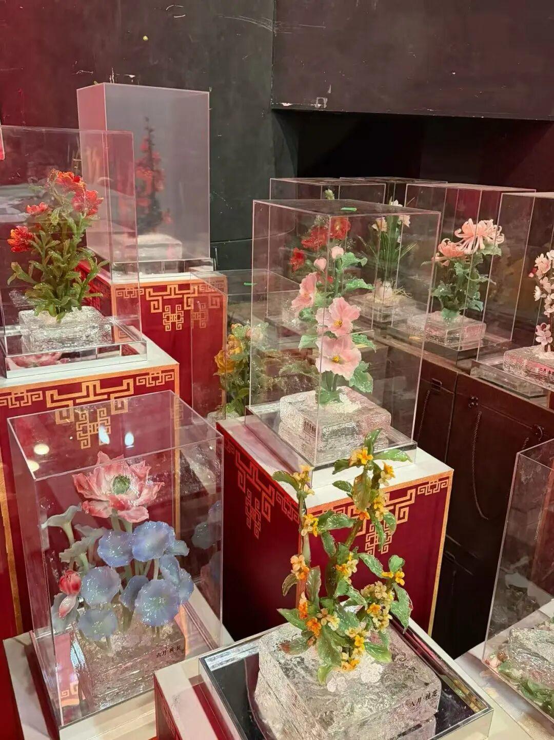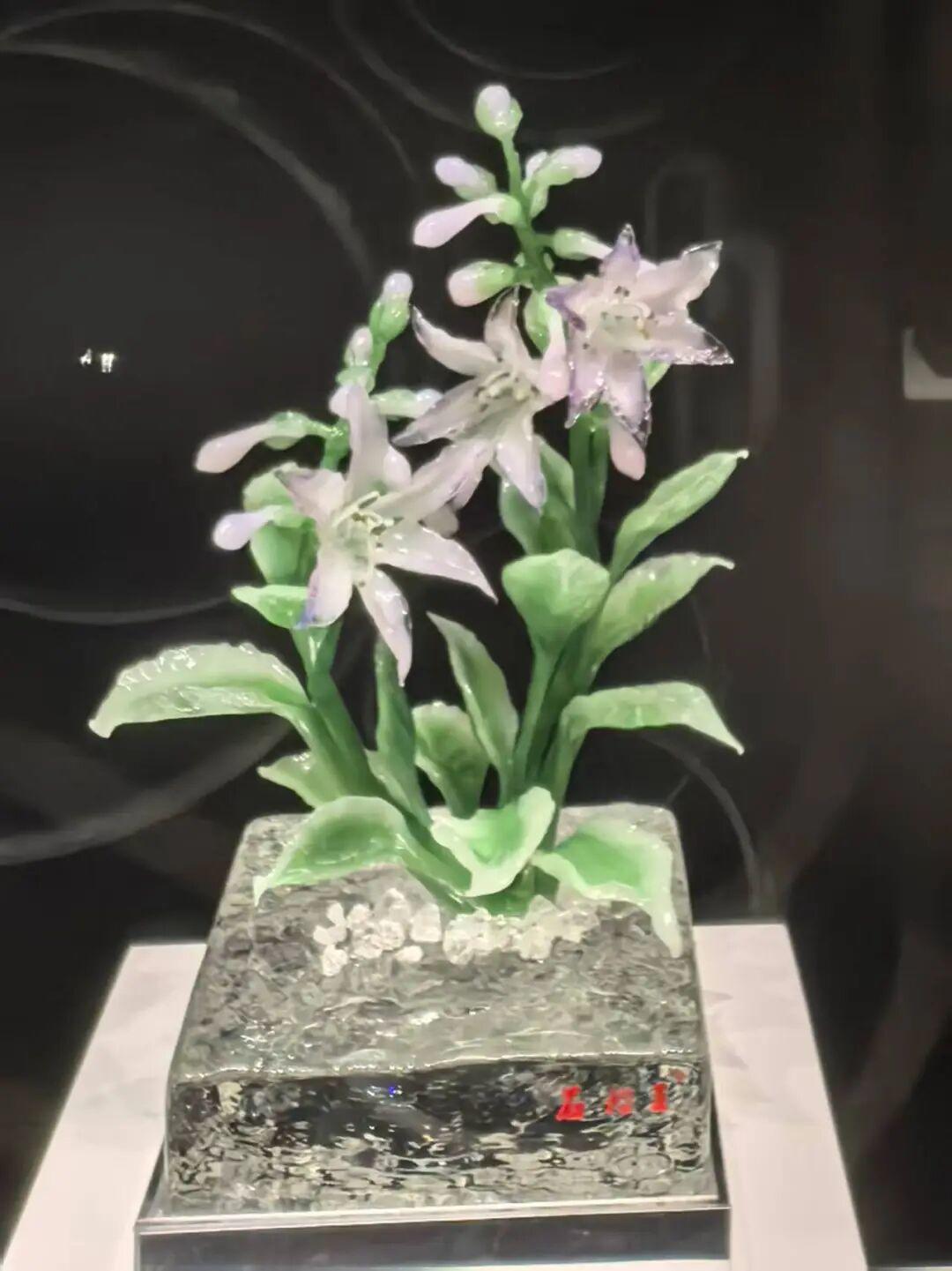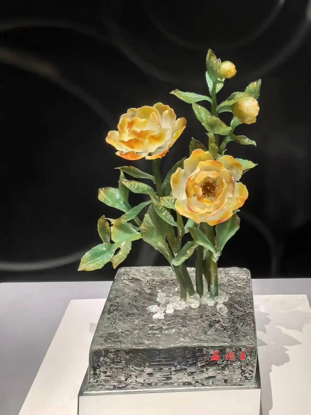 这组作品出自山东省工艺美术大师宋苗之手。在琉璃工匠们的眼中,琉璃成型后看似冰冷的材质,源自于“火中的雕塑艺术”。在千度高温的火焰下,琉璃料棒被精准掌控,拉丝、点缀、塑形,每一个呼吸的间隙都考验着力道与温度的博弈。正月梅花的凌寒、六月荷花的清雅、腊月水仙的灵动,皆在方寸之间被真实还原。