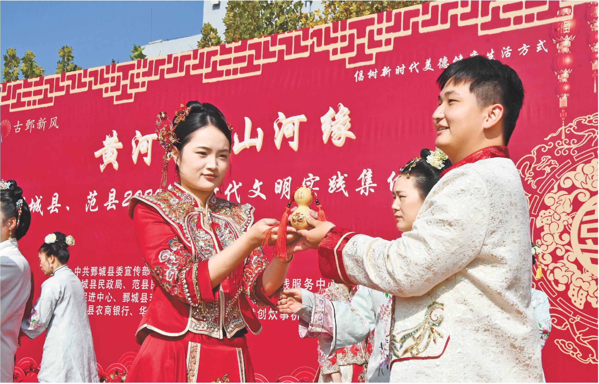鄄城县和范县隔黄河相望、地缘相近、人文相通,黄河不仅滋养了两岸的沃土,更缔结了两县深厚的情谊。这次集体婚礼,将新人们的爱情与黄河的情缘紧紧相连,既弘扬了简约适度、文明向上的婚俗新风,也为两县新时代文明实践工作写下了浪漫的一笔。