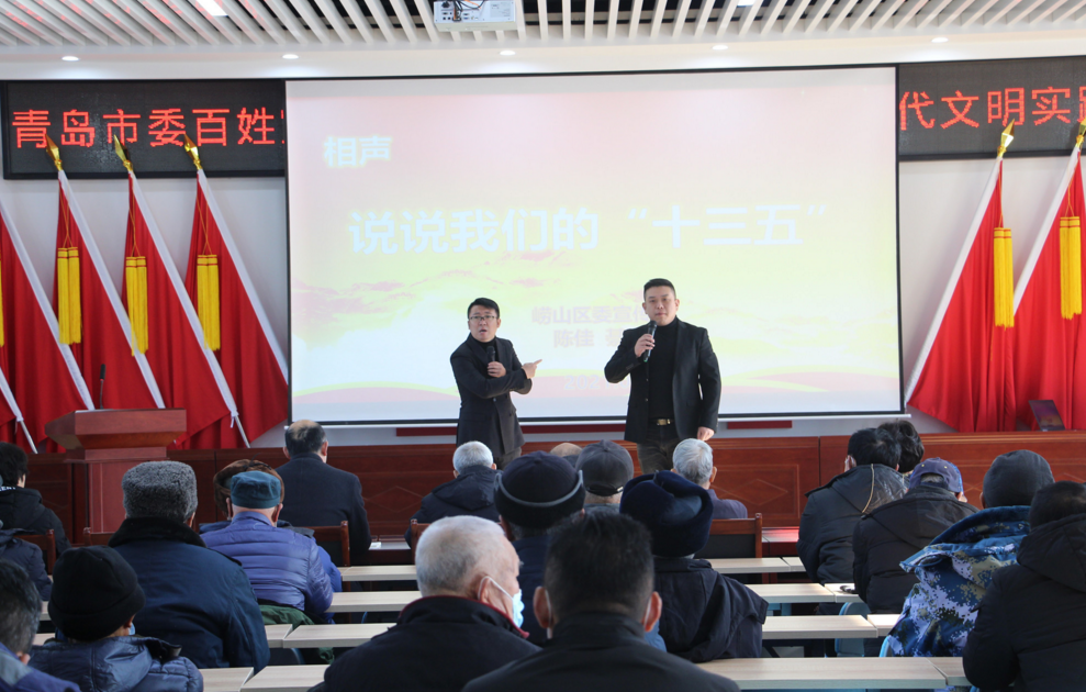 深冬时节,寒意浓浓;山海小城,热潮涌动。1月8日,青岛市学习贯彻党的十九届五中全会精神百姓宣讲团走进崂山区王哥庄街道曲家庄社区的新时代文明实践站,宣讲员们围绕“十三五”期间身边发生的“小事”,将大道理变成小故事,借助小品、相声等群众喜闻乐见的文艺形式,展成就、说变化。
