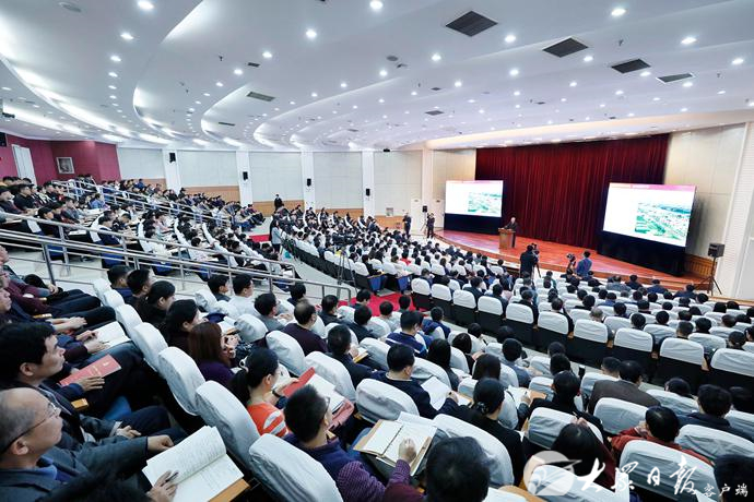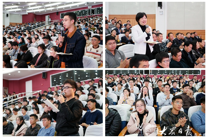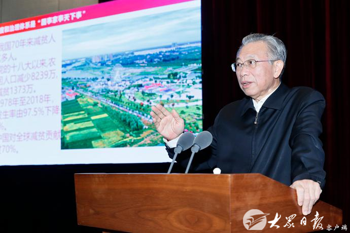 刘家义结合自身经历和工作实际,从经济发展、安全稳定、民生福祉、科技进步、政治文明、国防军事、国际地位等七个方面,介绍了近年来国家发展取得的辉煌成就和人民生活发生的巨大变化,阐明了全会的重大意义,阐述了中国特色社会主义制度和国家治理体系的科学内涵和本质特征,阐述了坚持和完善中国特色社会主义制度、推进国家治理体系和治理能力现代化的重大意义、总体要求、总体目标、重点任务和根本保证,对深入领会全会精神、坚定“四个自信”谈了认识体会。宣讲运用古今中外大量生动鲜活的案例、数据、图表进行讲解,主题鲜明、重点突出,深入透彻、通俗易懂,对深入学习领会全会精神提供了有力辅导。刘家义还与师生进行了互动交流、答疑解惑,对践行初心使命、推动高校高质量发展、服务乡村振兴等具体问题一一作了回答,积极回应大家关心关注的现实问题。在场师生认真听、认真记,踊跃提问,现场气氛活跃,不时响起热烈掌声。