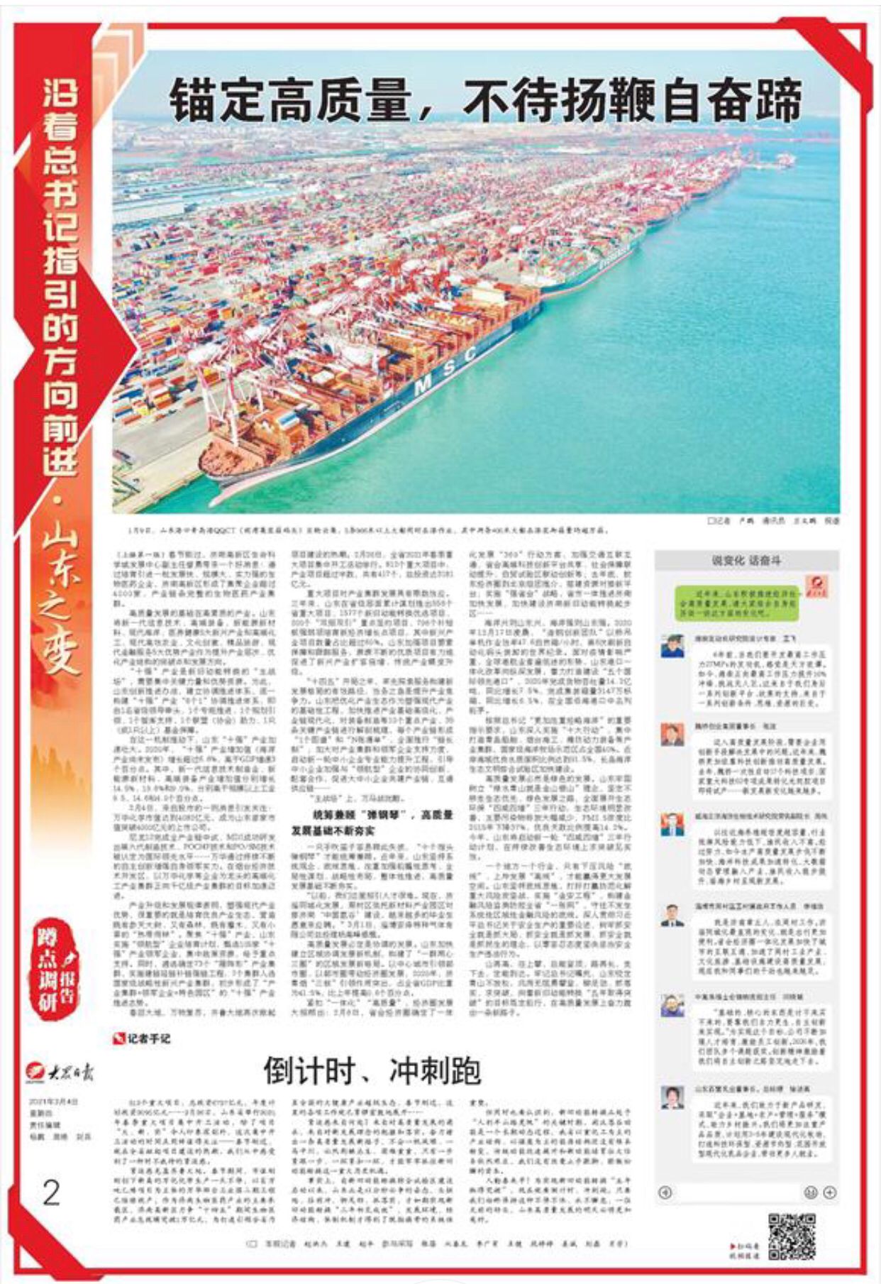 蹲点调研报告《锚定高质量,不待扬鞭自奋蹄》,报道山东深入贯彻新发展理念、扎实推进高质量发展,新旧动能转换“三年初见成效”的探索实践。