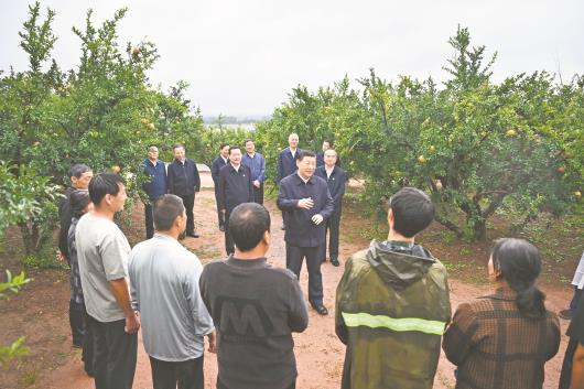 新华社记者燕雁报道 9月24日,中共中央总书记、国家主席、中央军委主席习近平在浙江考察结束返京途中,来到山东省枣庄市考察。这是习近平在位于峄城区的冠世榴园石榴种植园同老乡们亲切交流。