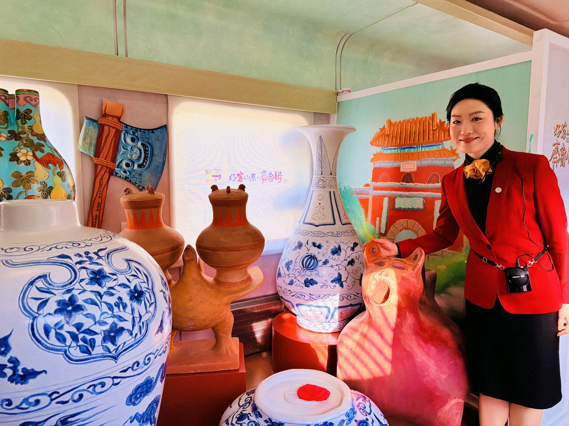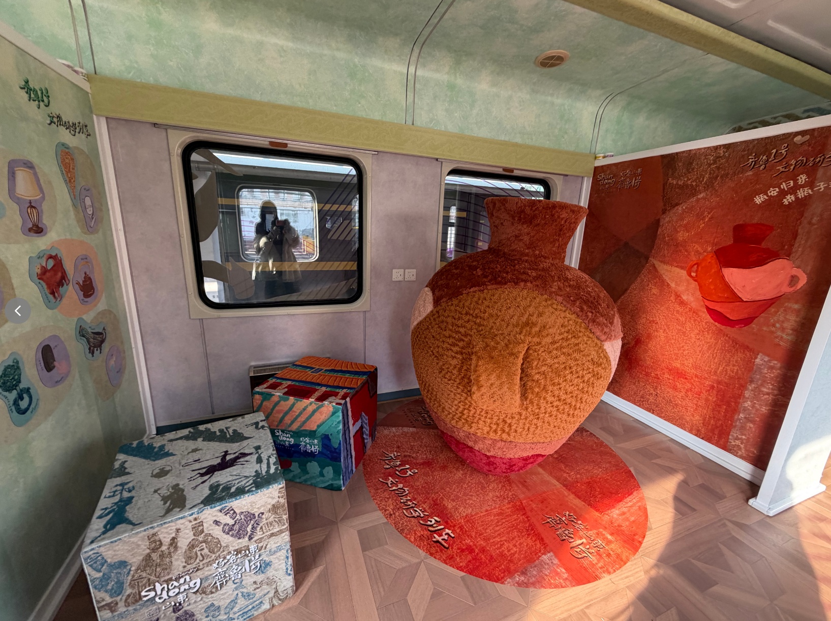 登上列车,七节主题车厢让他们惊喜不已——青铜、玉、瓷、陶、画像石、建筑、服饰,齐鲁燕赵的文物精华被浓缩于一列火车之中。走进每节车厢,都仿佛推开了一扇博物馆的大门:青铜车厢的壁面上,青铜礼器的纹路清晰可见;瓷主题车厢里,手绘青花龙纹梅瓶瓷器惟妙惟肖……