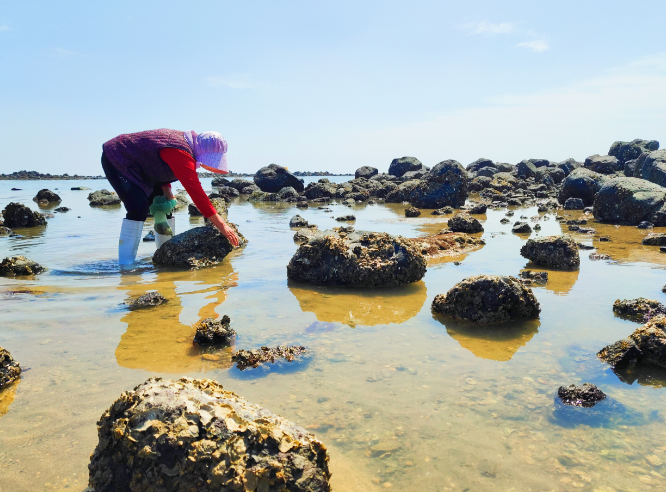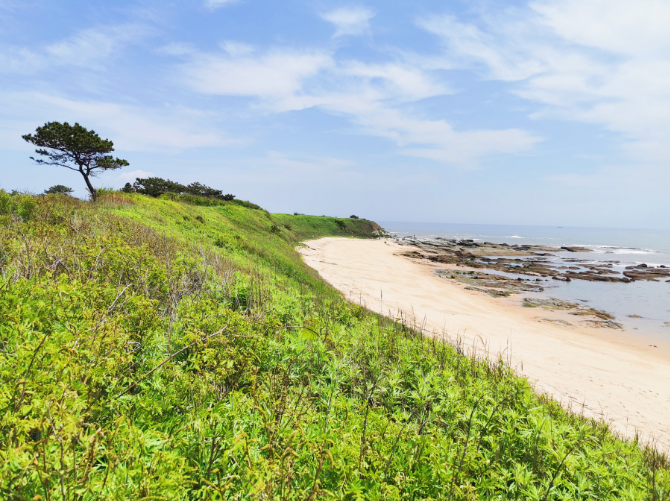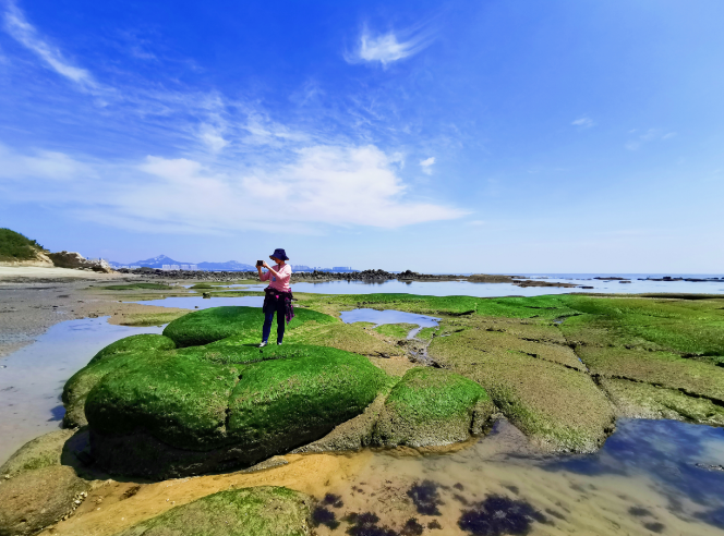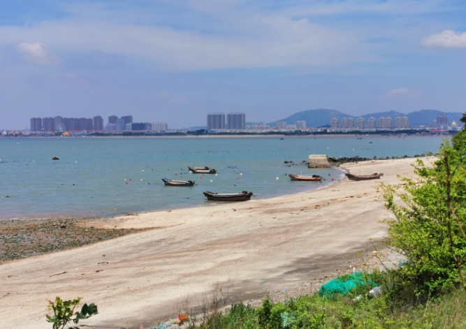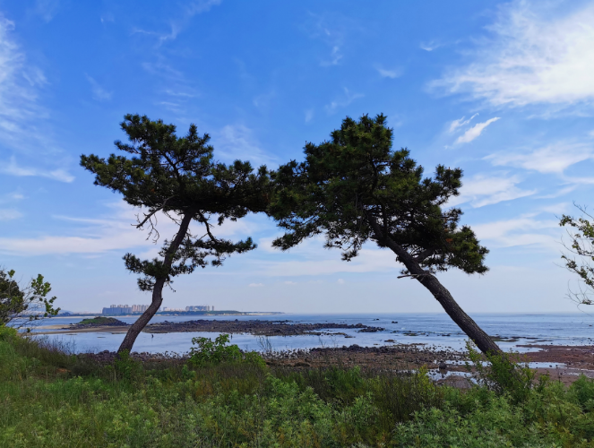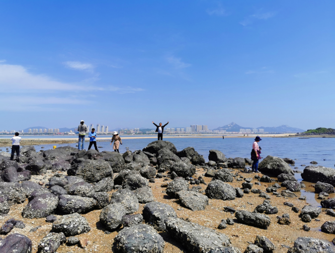 山东威海乳山市银滩旅游度假区正南面海中,有一座形似卧伏的公鸡的小岛,被称为公鸡岛,后人将其改名为宫家岛。宫家岛地势平缓, 海岸线以上南北长850米,东西长570米,岛上绿树成荫,植被覆盖率为60%。宫家岛距海岸线的最短距离为1700米,从银滩大拇指广场南海岸坐船登岛,仅需10分钟船程。海岛东侧是一片礁石群,礁石上布满了硬壳,除去常见的牡蛎外,还有很多小小的“火山锥”——藤壶。涨潮时,它们会从壳里伸出柔软的身体,退潮后,它们又会掩上“房门”闭关自守。再向南行走,可以看到一大片沙滩,大量的贝壳和卵石被海浪冲上沙滩,沿着海浪的痕迹散落着,银白色的沙子在阳光下闪烁着钻石般的光泽。这里的海滩非常绵软,沙质洁白细腻,踩上去异常舒服,偶尔会看海鸟在平整的沙滩上留下一排排爪印。宫家岛周边海域水产资源丰富,部分渔民在此从事捕捞或养殖作业。岛上没有常住居民,只有上岛歇脚或暂住的渔民和养殖户。岛上除了渔民自建小屋,还有几处废弃的驻军营房。隔海看着对岸如同海市蜃楼般的高楼与房屋,有种遗世独立的归隐感。摄影报道/马千里 司伟 王嘉 姜俏俏