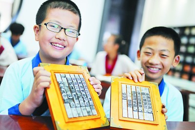 小朋友们正体验活字印刷,亲手制作《论语》。杨国庆摄/光明图片