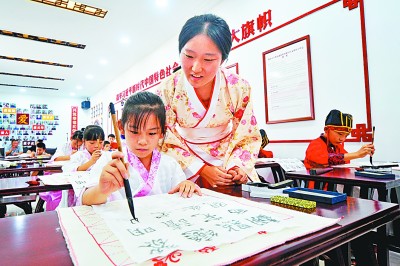在曲阜市小雪街道南雪村新时代文明实践站内,正进行青少年书法培训。杨国庆摄/光明图片