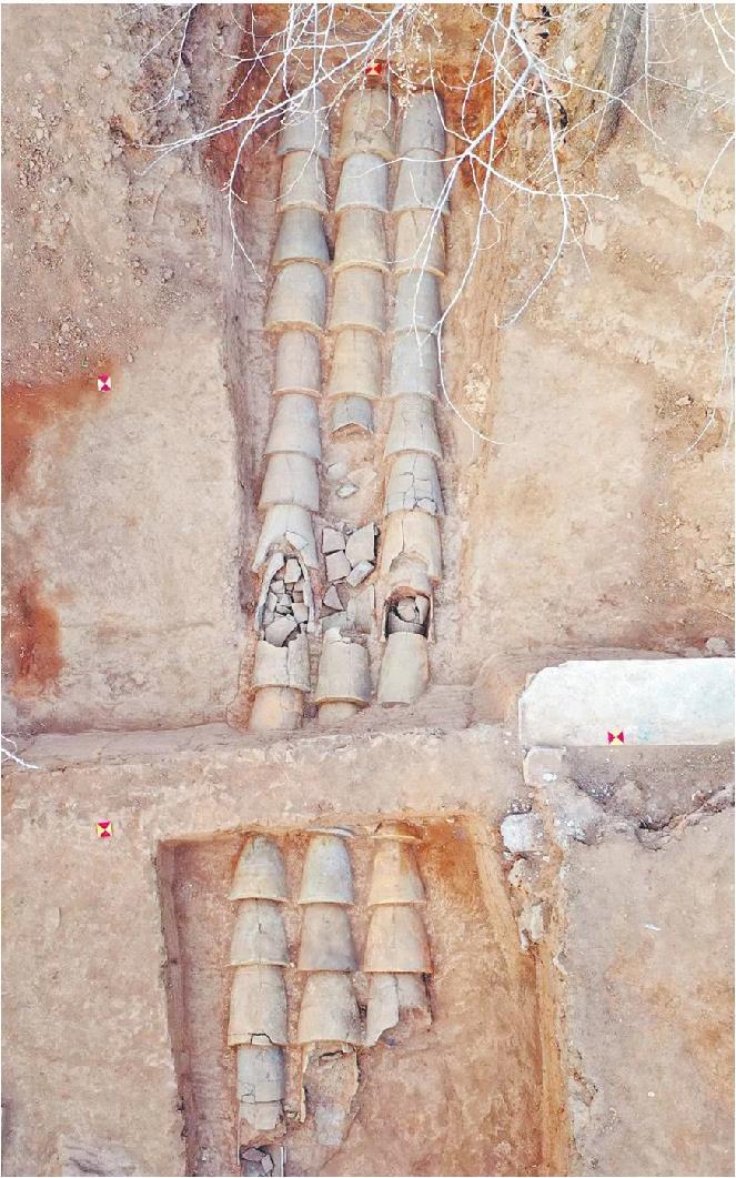 琅琊台遗址山顶建筑基址东北部排水管道(上为北)。