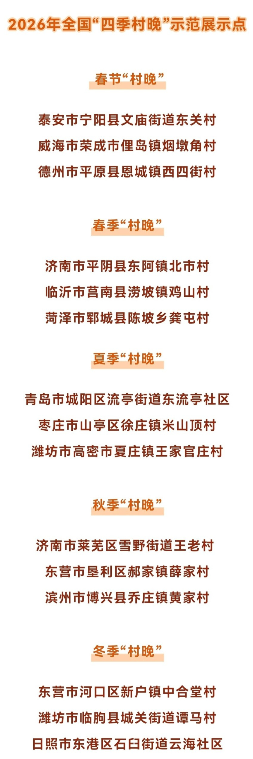 近日,文化和旅游部公布了2026年全国“四季村晚”主场和示范展示点名单,泰安市宁阳县文庙街道东关村、威海市荣成市俚岛镇烟墩角村、德州市平原县恩城镇西四街村等山东15地上榜,数量并列全国第一。