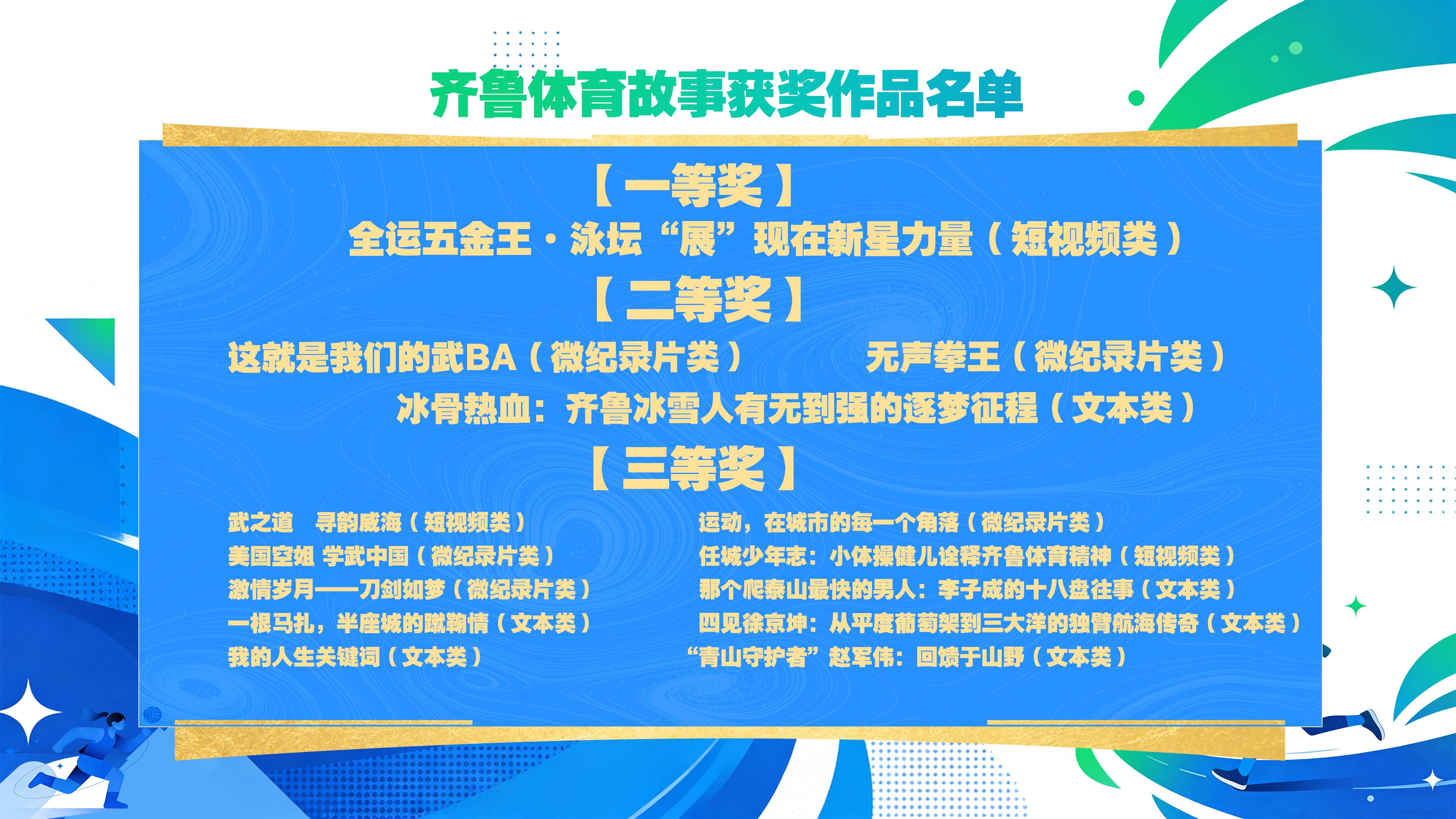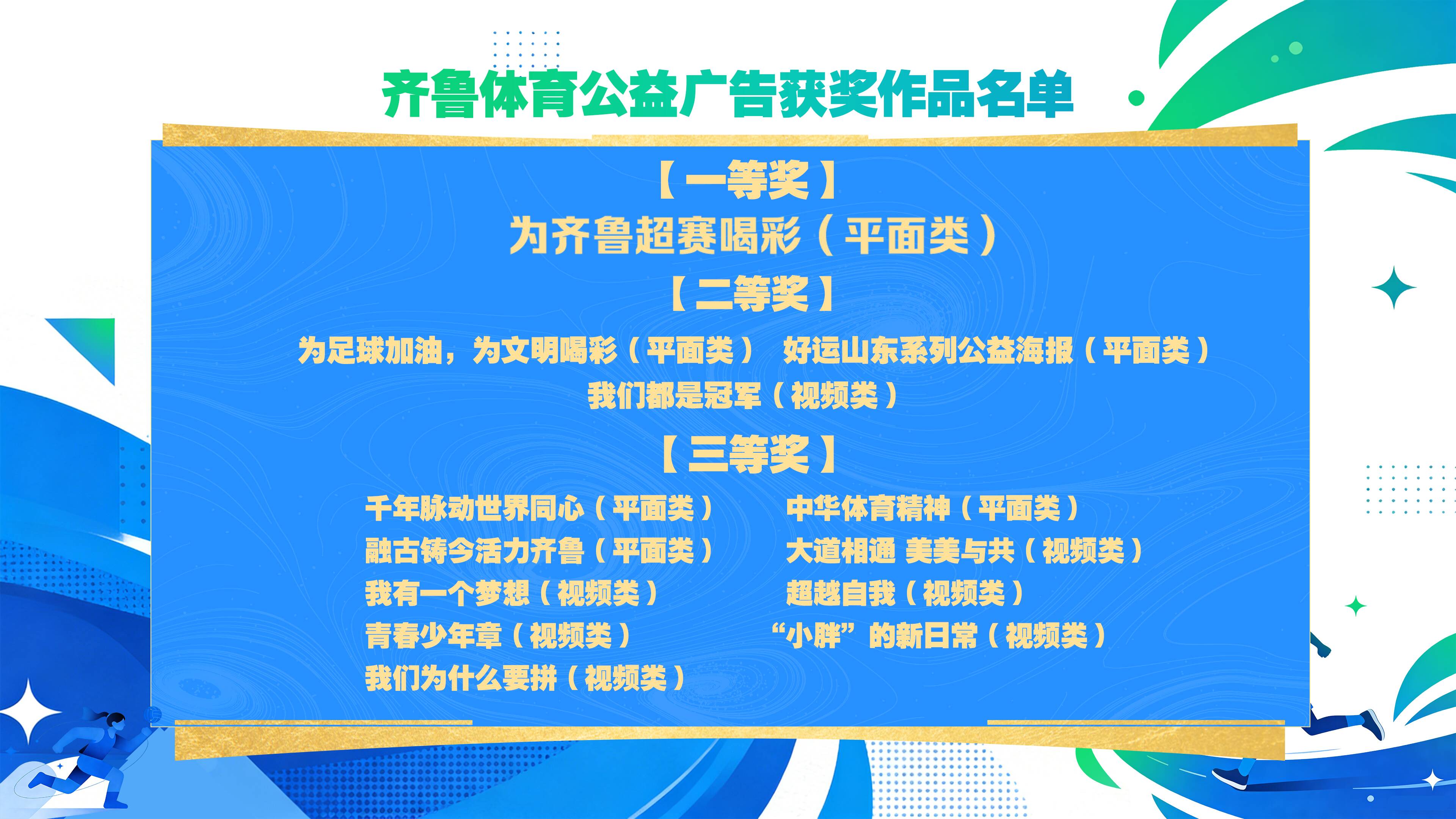 去年9月,由山东省精神文明建设办公室、山东省文化和旅游厅、山东省体育局、大众报业集团、山东广播电视台等单位联合主办的齐鲁体育公益广告和齐鲁体育故事征集活动正式启动。活动以弘扬中华体育精神、培育体育文化为主题,以“讲好山东体育故事”为核心,共收到社会各界推荐的700余件作品,最终27件佳作脱颖而出。《为齐鲁超赛喝彩》系列海报、《全运五金王·泳坛“展”新星力量》微纪录片等作品,生动诠释了赛事精神、运动员成长轨迹,用艺术语言传递了运动魅力、竞技激情和体育文化温度。