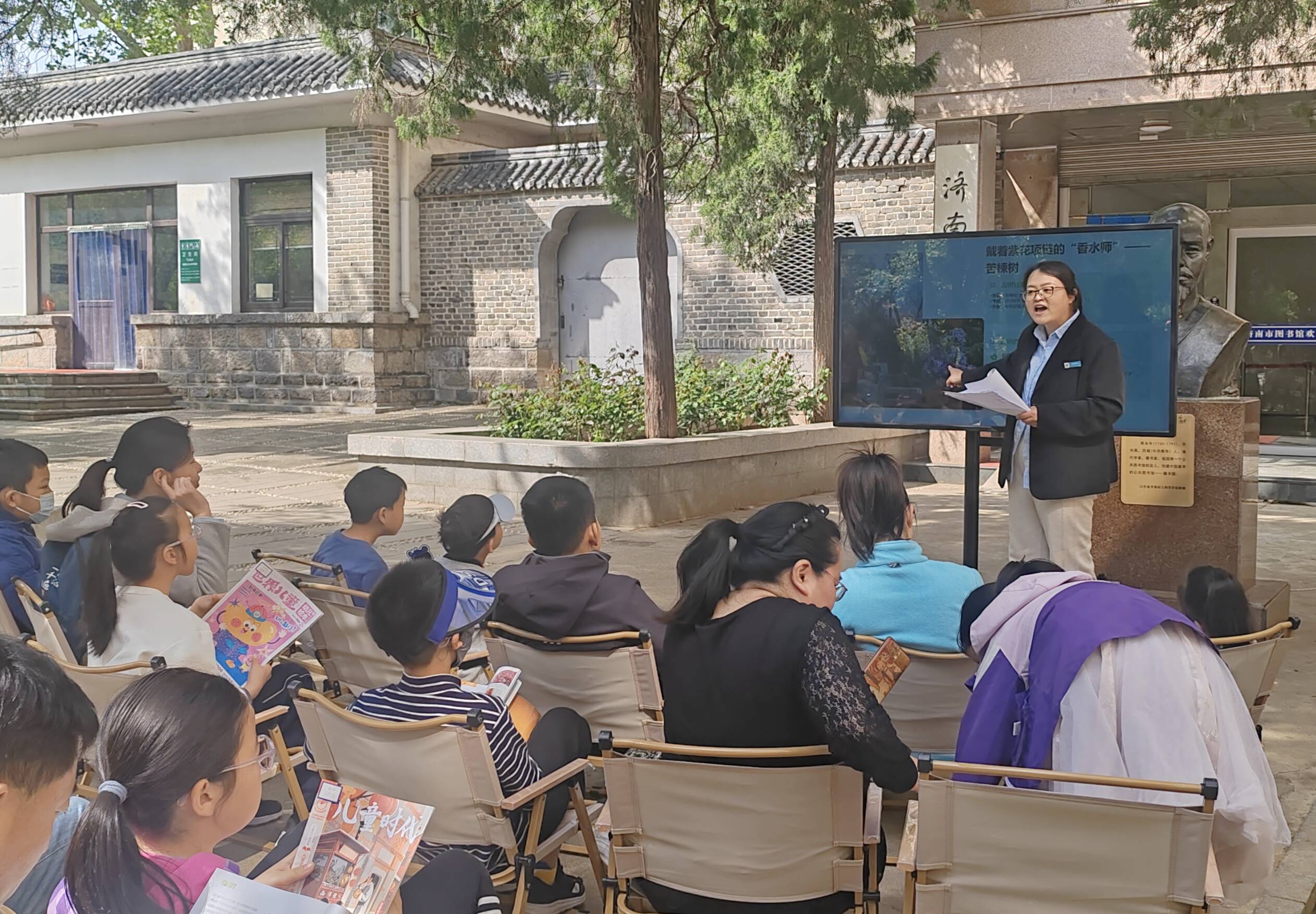 活动伊始,济南市图书馆工作人员为孩子们带来一场生动的“古树科普小讲堂”,讲述了古树群的历史与生态价值。随后,小读者们通过抽取任务卡的方式,分别认领一株古树,化身“小小讲解员”,带领大家依次探访杜梨、山皂荚、小蜡、侧柏、苦楝、银杏等古树。在孩子们童趣盎然的讲解后,公园工作人员补充介绍了每株古树的生长习性与文化故事。从苦楝280年的岁月沉淀,到百年小蜡的珍稀身份,再到银杏秋日“黄金雨”的浪漫传说,古树仿佛被“打开”的一本本自然史书,引得家长与孩子们频频驻足、赞叹不已。