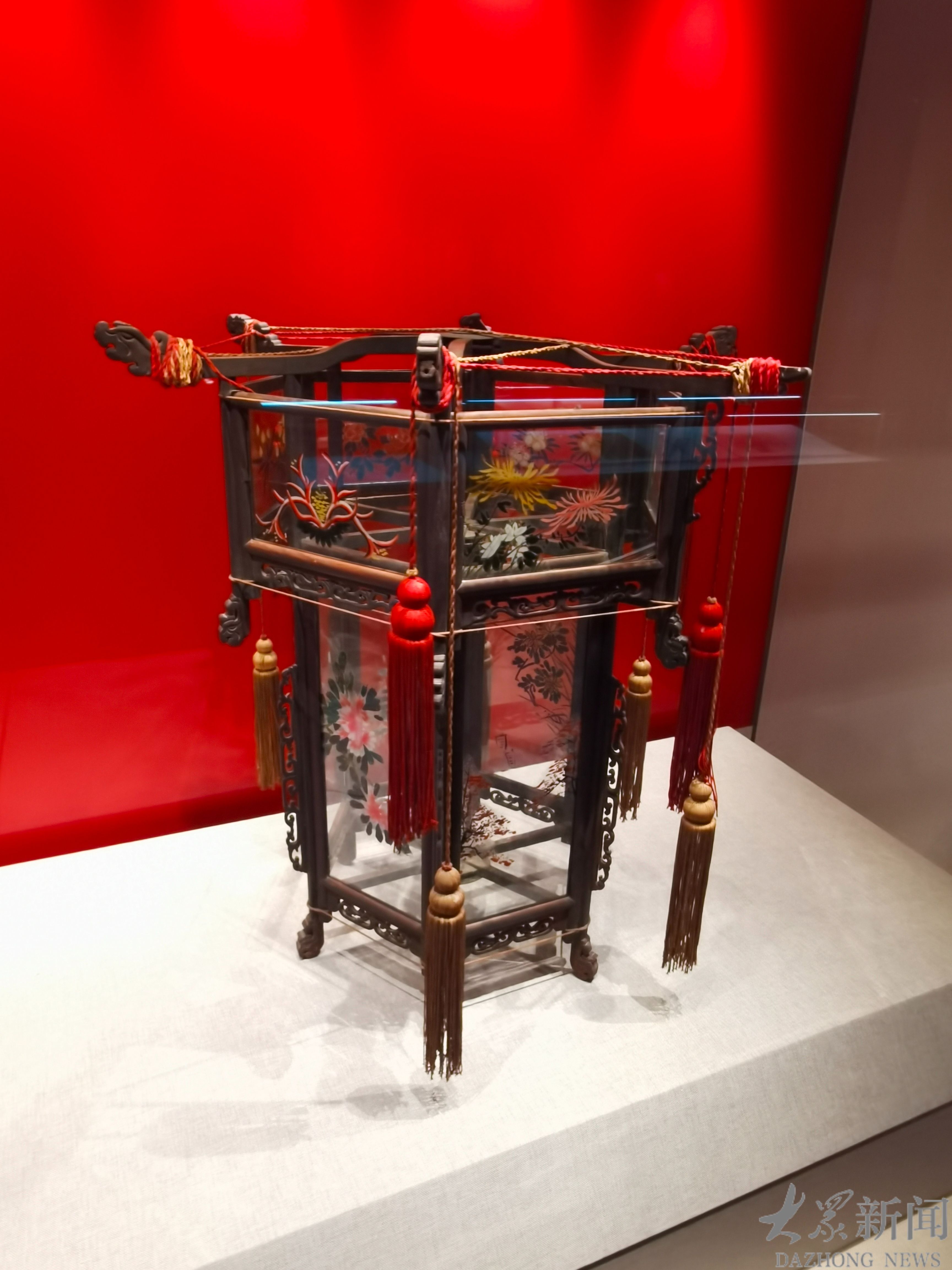元夜的灵魂在灯。此次展出的清六棱玻璃宫灯,宽65厘米,高73厘米。这盏宫灯,是中国传统灯具的经典范本。硬木为骨,以传统榫卯之术拼接成六方框架,无钉无铆,却坚牢如初。外镶通透玻璃,表面绘就花鸟清欢,风过处,流苏轻摇,光影流转,既承照明之实,又兼装饰之美。