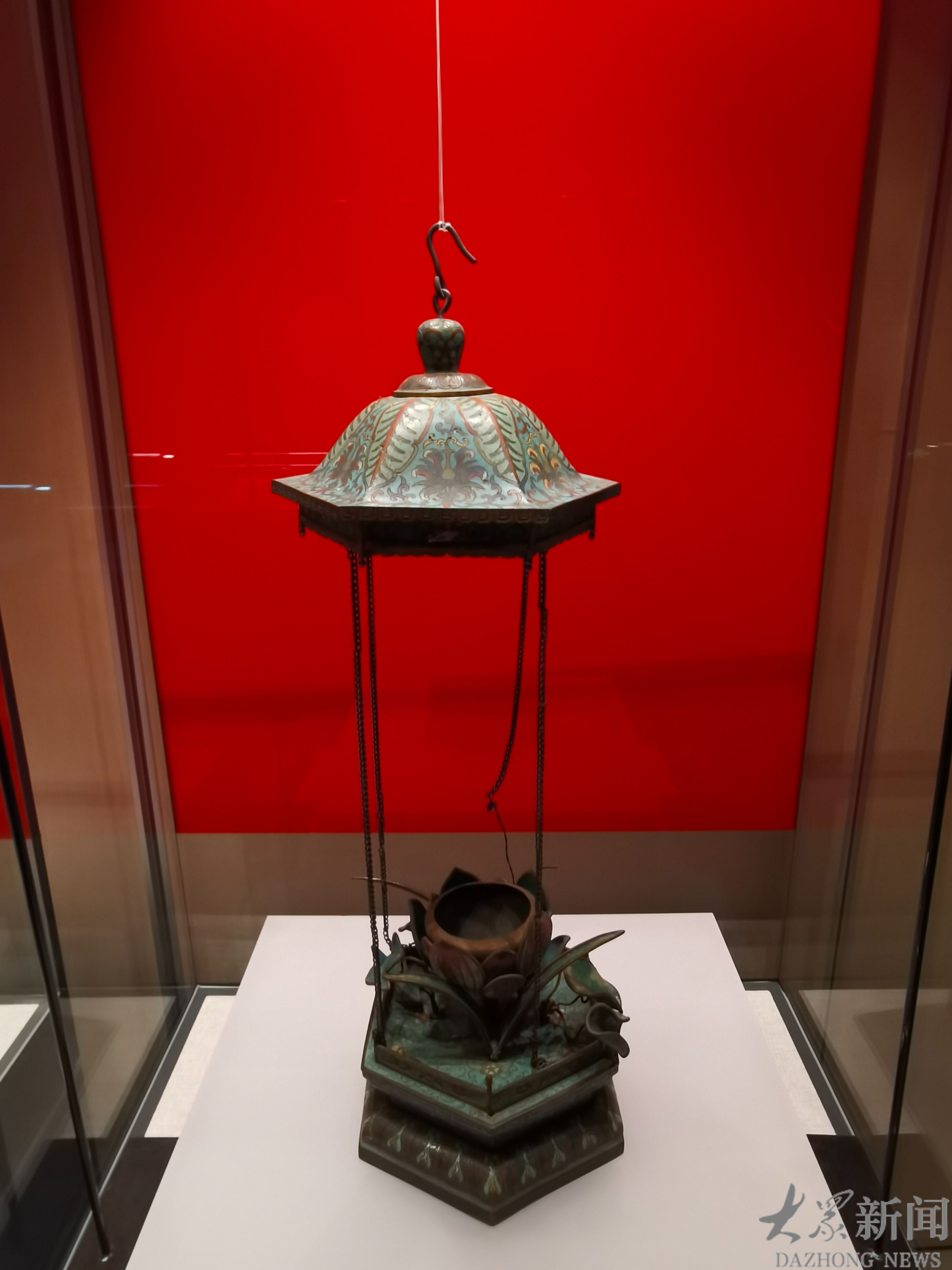 展出的清掐丝珐琅荷花吊灯,更显匠心独运。底径20厘米的器物,由盖、链、储液箱、座四部分组成,形制精巧。盖作荷叶舒展之态,顶有圆钮,中间便是盛放灯油的荷花形储液箱。底座为六角塔形,环设护栏,盖与座以四条银链相连,错落灵动。盖面饰芭蕉叶纹与宝相花纹,缠枝纹缠绕盖钮,底座则缀以花草、莲瓣、曲带诸纹,将掐丝珐琅的精湛工艺,与荷花的高洁意象,融于一盏灯之间。