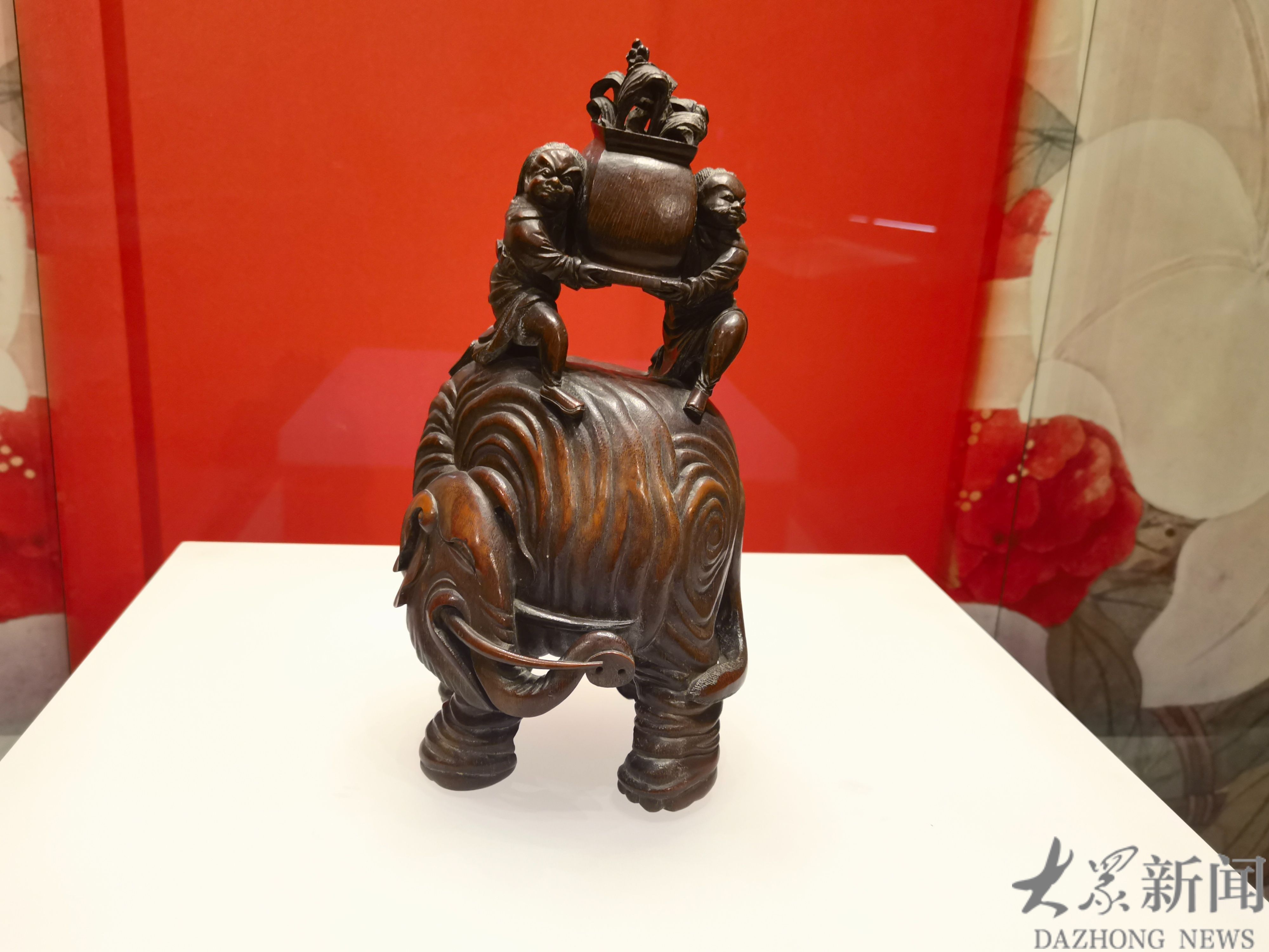 一件明竹雕“万象回春”摆件,则将元宵的祈愿,凝于竹的清劲之中。摆件长14.5厘米,宽14厘米,高30厘米,以温润竹材为料,集立体圆雕、浮雕、透雕之大成。雕作中的大象,身形敦实,长牙卷鼻,大耳如扇,口微张,眼半阖,回首卷尾,足趾分明,通体饰回旋纹路,既厚重沉稳,又不失灵动。象背之上,两人长发垂肩,单跪跨步,双手共捧一盆万年青,绿意盎然,寓意“万象回春”。