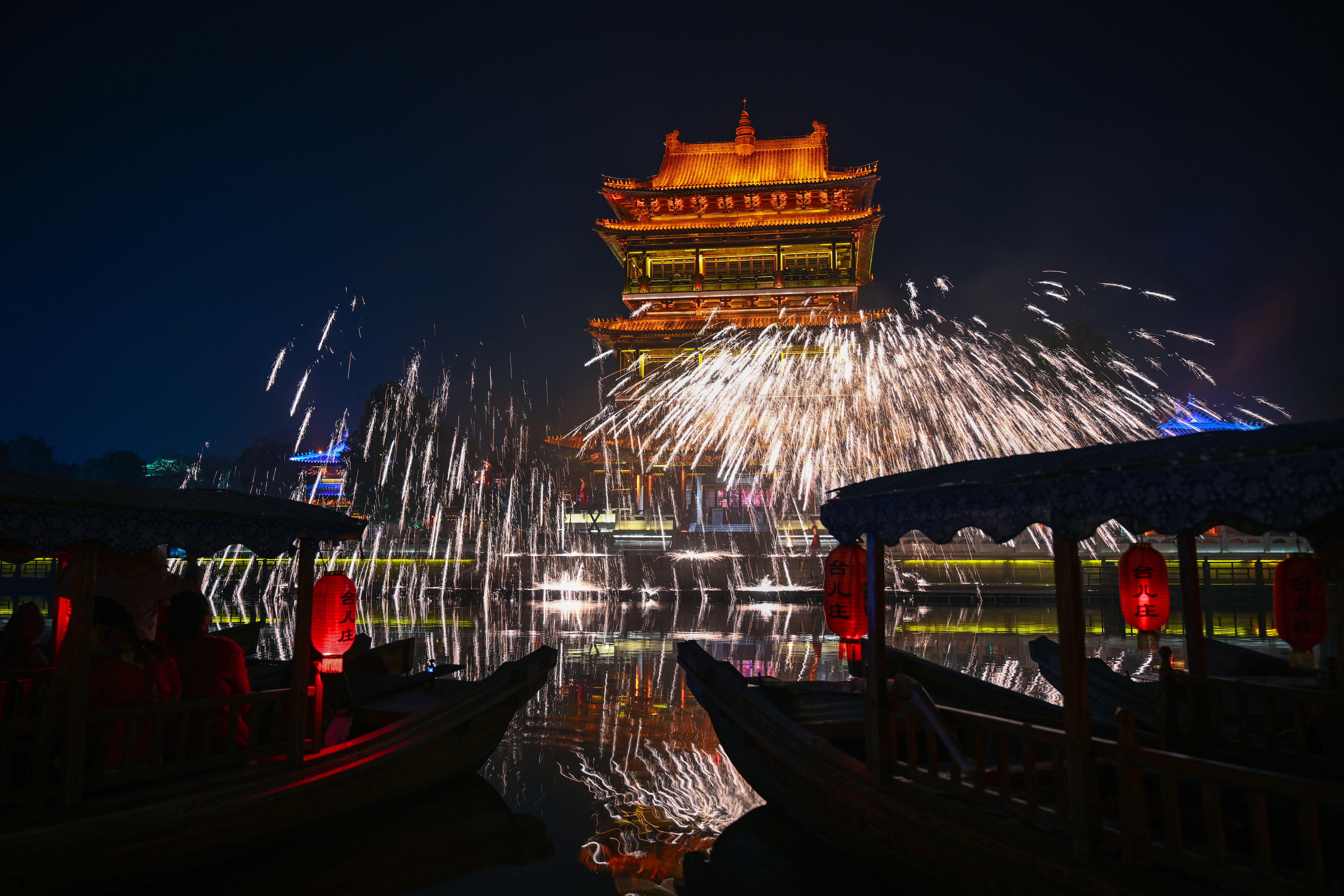 在台儿庄古城,摇橹船与非遗火龙钢花表演营造浓郁年味。 邵凯 摄