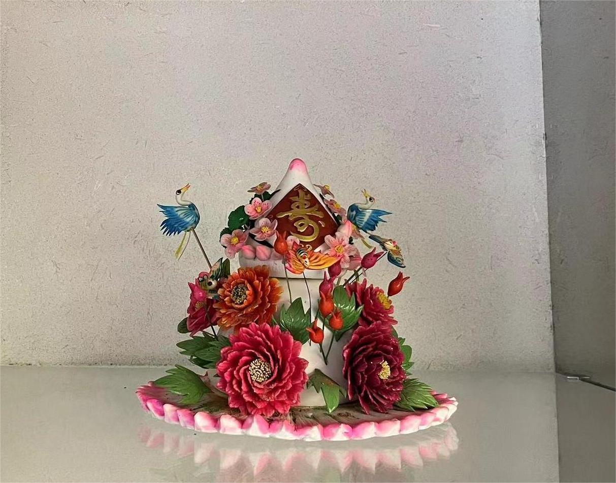 面塑,俗称面花、礼馍、花糕等,是指以面粉、糯米粉等为原料制成熟面团后,用手和各种专用塑形工具,捏塑成各种具体形象的手工技艺。请欣赏面塑作品《福寿延年》。(作者:孙峰斌)