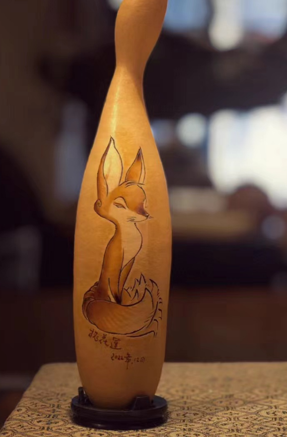葫芦烙画,又称烫画葫芦、火笔画葫芦,是一种特色传统工艺美术品。请欣赏葫芦烙画作品《狐狸》。(作者:老小余)
