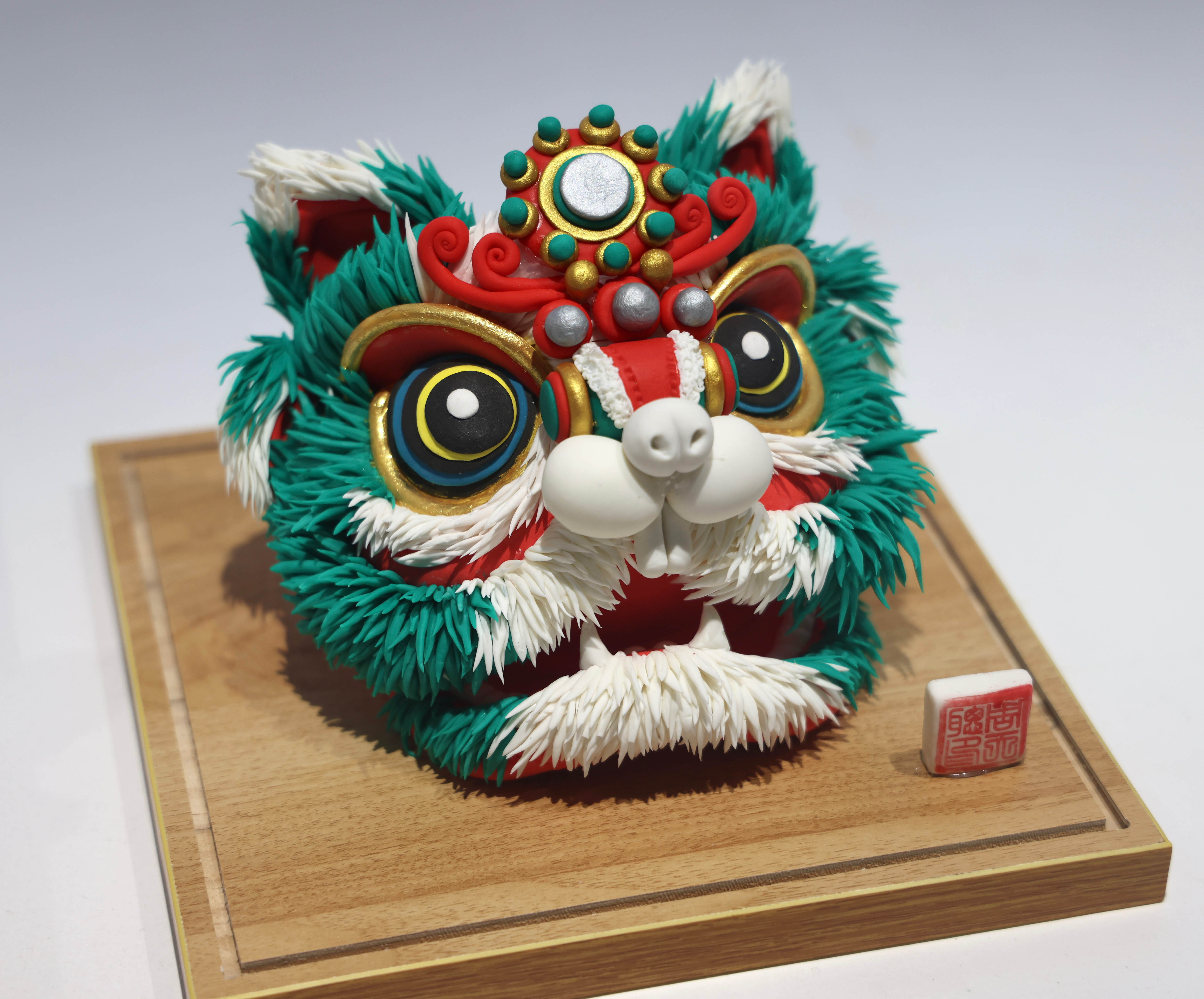 面塑文化历史悠久,被列为山东省级非物质文化遗产。面塑的原料是面粉,制作融合了雕塑和绘画两个艺术门类,是民族文化的活化石,具有深厚的历史文化价值和实用价值。“狮狮”(事事)如意配色以“红”“绿”为主,狮头造型既保留了传统狮子的形象,又加入当代时尚元素。(作者:周天聪)