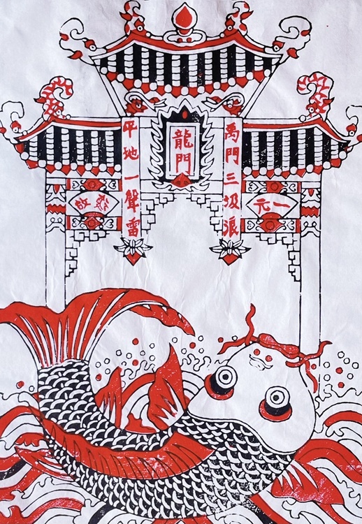 山东省日照市莒县木版年画题材广泛,内涵丰富。木版年画所具有的历史价值、文化价值和艺术价值,使其成为反映中国民间社会生活的百科全书。该木版年画作品为《鱼跃龙门》。