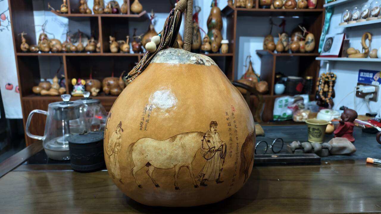 烙画又称火笔画,是中国传统艺术珍品,用火烧热烙铁在物体上熨出烙痕作画。烙画创作在把握火候、力度的同时,注重“意在笔先、落笔成形”。请欣赏葫芦烙画作品《五马图》。