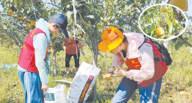 诸城市遭受冰雹、强风灾害后,社会各界积极行动起来参与救灾。图为诸城义工协会的小志愿者在帮农户抢收梨子。