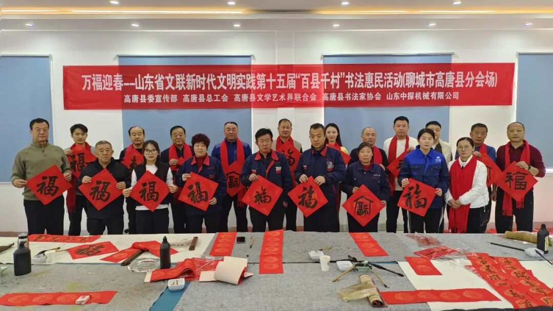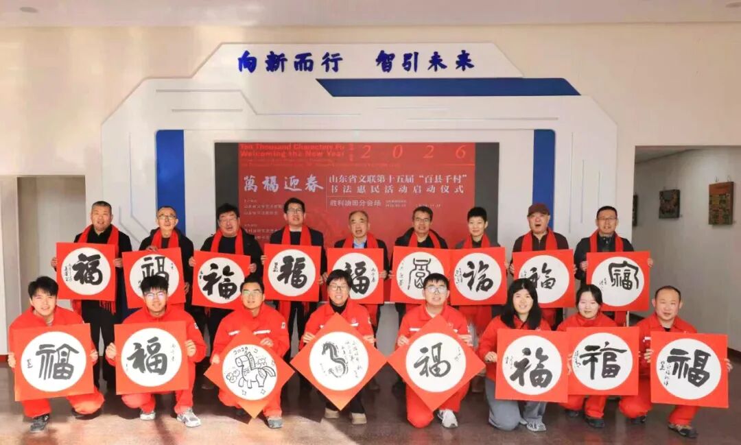 在孤岛采油厂管理五区,孤岛采油厂工会副主席张涛,胜利油田书协主席郝守波,副主席熊辉、杨旭,秘书处张新建,副秘书长郝道杰、刘红军,理事陈玉清、马鲁及60余名职工参加此次活动。书法家们为职工及家属创作了春联200余副,“福”字200余个,增添了浓浓的节庆气氛。