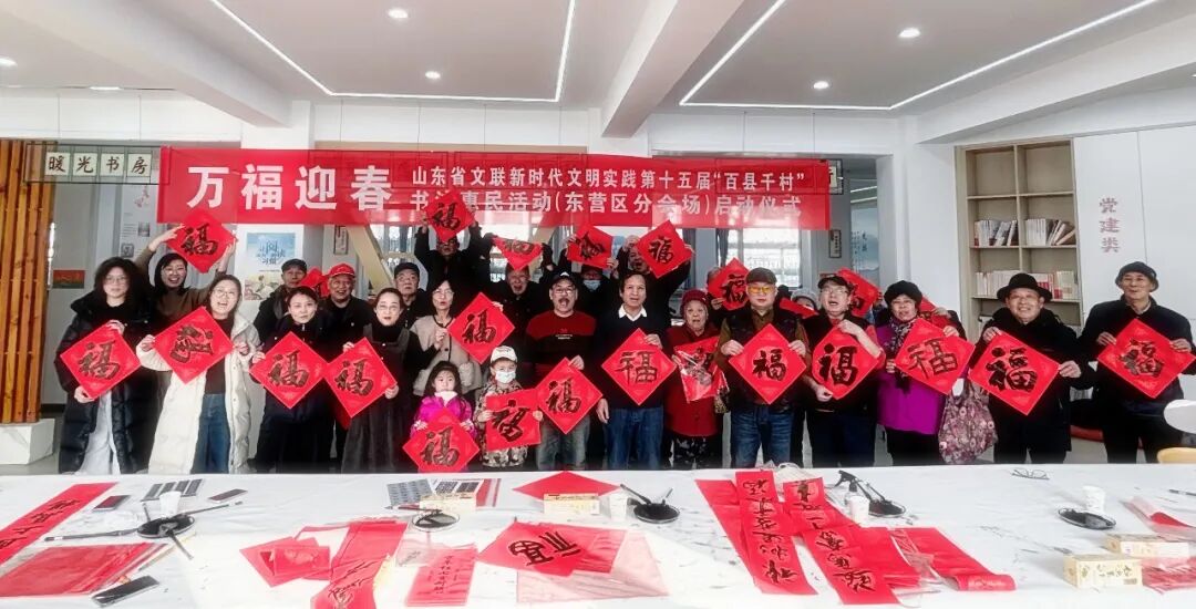 在东营河口区河口街道东劝村文化广场,东营市文联党组书记、主席隋强,河口区委副书记、河口街道党工委书记杨文娟,河口区文联主席黄润超,东营市书协党支部书记申晓明,河口街道东劝村支部书记牛建国,东营市书协曹洪岭、宋清文、曲建立、李增志、杨生文、周文波、马浩、商海港,河口区书协主席王金星,当地书法骨干马守河、李祥玉、张东河、刘宝安、吕双辉、牛立波以及当地群众共300余人参加了分会场启动仪式。东营区、垦利区、广饶县、利津县、东营港经济开发区也同步启动。截至当天上午,全市共有76名书法家参与服务,累计书写春联2020副,“福”字4320个,惠及群众1600余人。