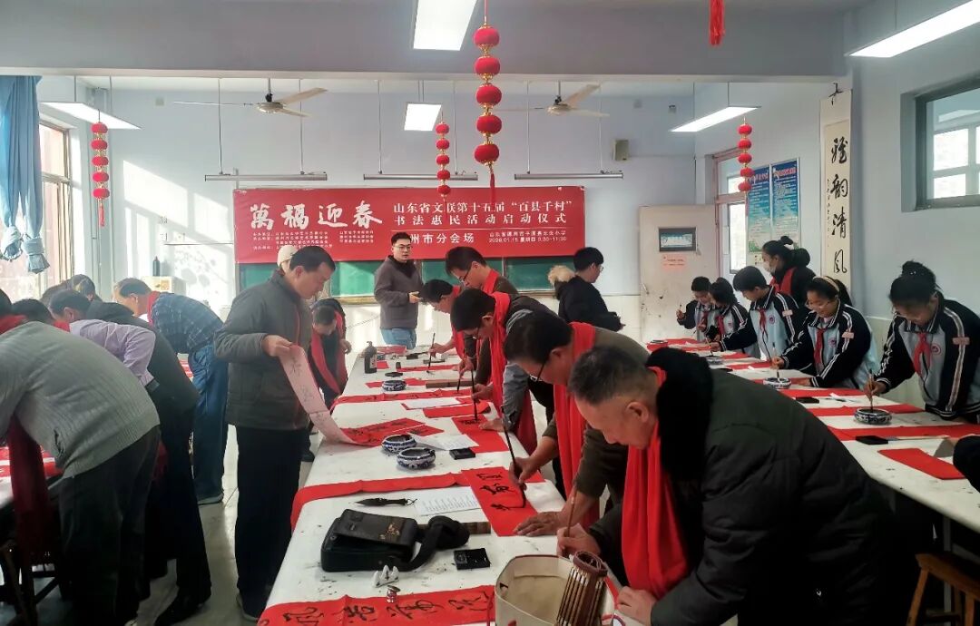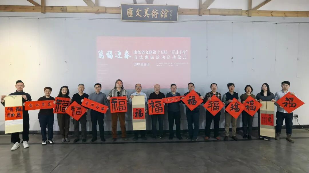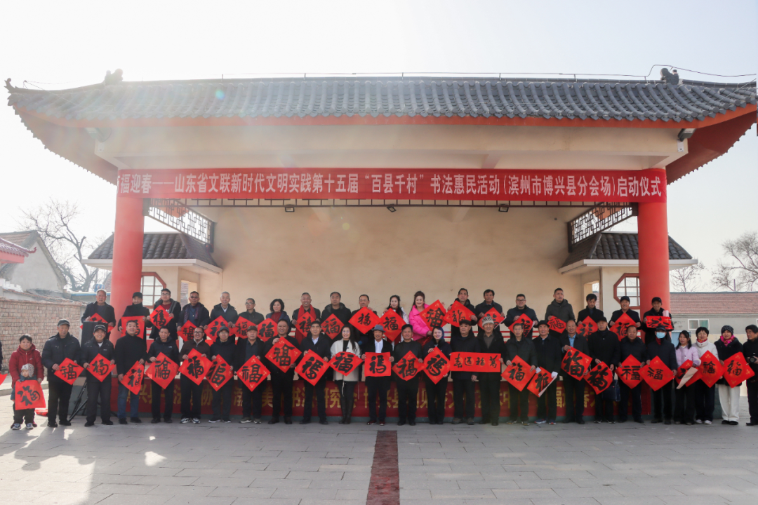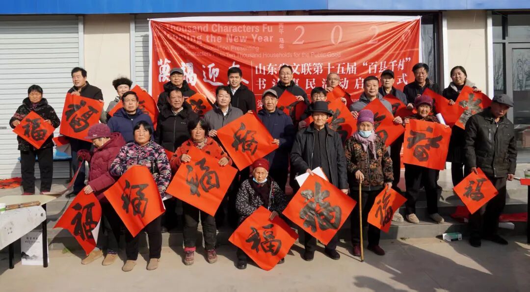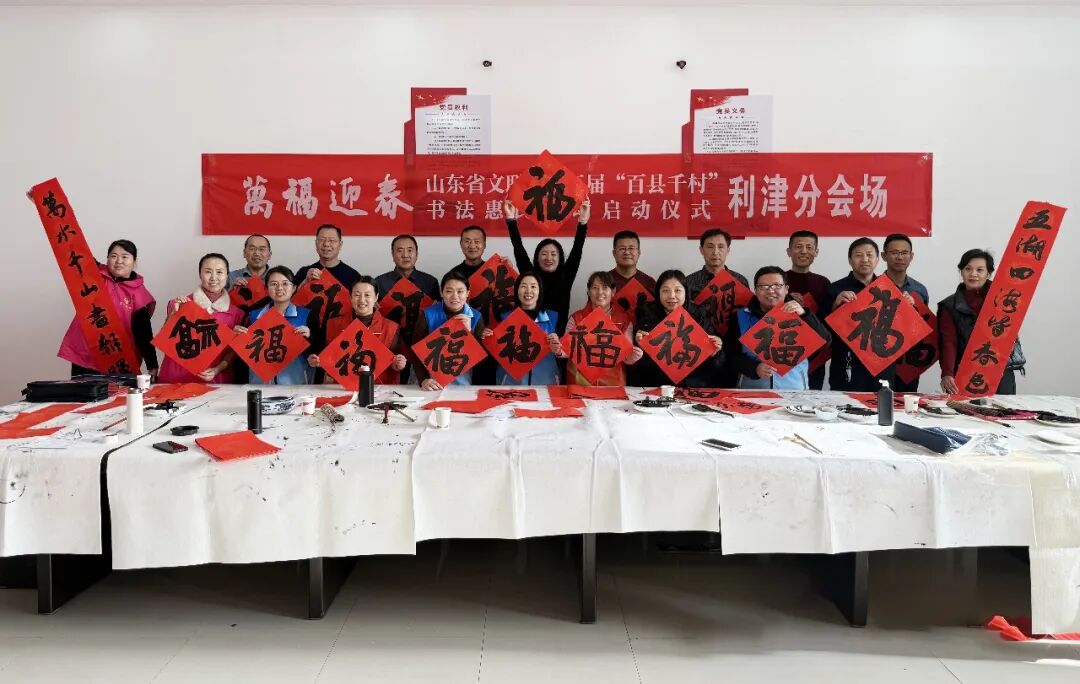 在滨州沾化区东平村,滨州市文联党组成员、副主席王其槐,市文联副主席、市书协主席郭庆利,市书协名誉主席陈杰,市书协副主席兼秘书长杨健,市书协副主席刘海航,沾化区书协40位书法家和当地群众共300余人参加了分会场启动仪式。滨城区、邹平市、惠民县、阳信县、无棣县、博兴县、经济开发区、北海新区均同步开展活动,共有220余位书法家在2个小时内创作了5000余副春联,8000多个“福”字,300件书法作品,开展了9次书法大讲堂。