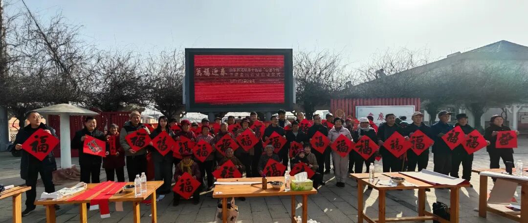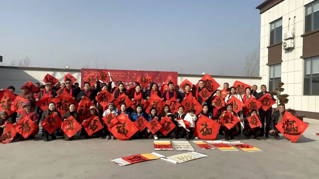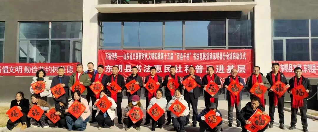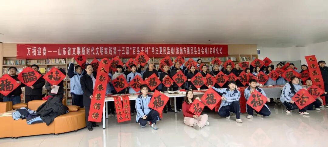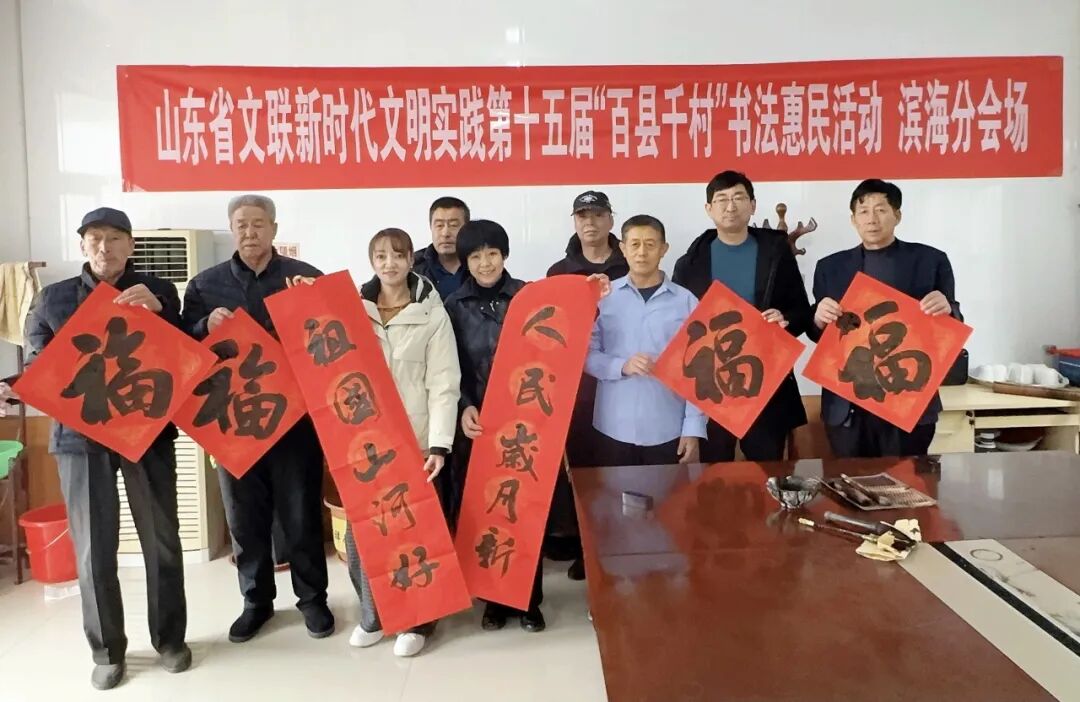 在滨州沾化区东平村,滨州市文联党组成员、副主席王其槐,市文联副主席、市书协主席郭庆利,市书协名誉主席陈杰,市书协副主席兼秘书长杨健,市书协副主席刘海航,沾化区书协40位书法家和当地群众共300余人参加了分会场启动仪式。滨城区、邹平市、惠民县、阳信县、无棣县、博兴县、经济开发区、北海新区均同步开展活动,共有220余位书法家在2个小时内创作了5000余副春联,8000多个“福”字,300件书法作品,开展了9次书法大讲堂。